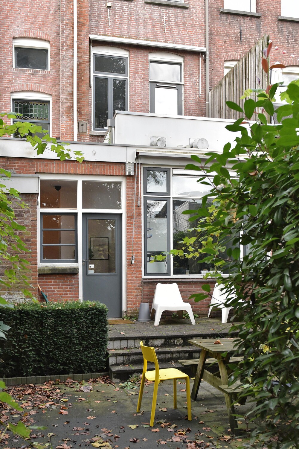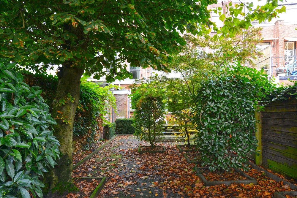 Diepe, zonnige achtertuin (ca.15m x 5.50m) met terras en achterom naar het Kerkpad (tevens parkeren mogelijk aan het Kerkpad).