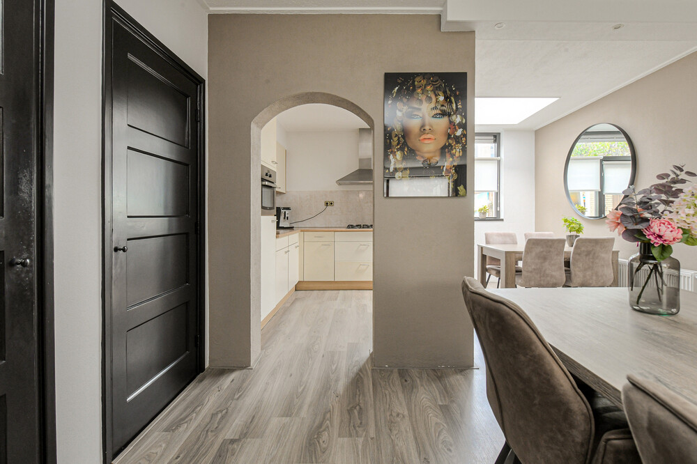 De semi-open keuken is gelegen aan de achterzijde en is voorzien van een aanrecht in hoekopstelling met een houtlook blad, rvsspoelbak, 4-pits gaskookplaat, rvs-afzuigkap, combi magnetron, koelkast, kastruimte en aansluiting (vaat-)wasmachine.