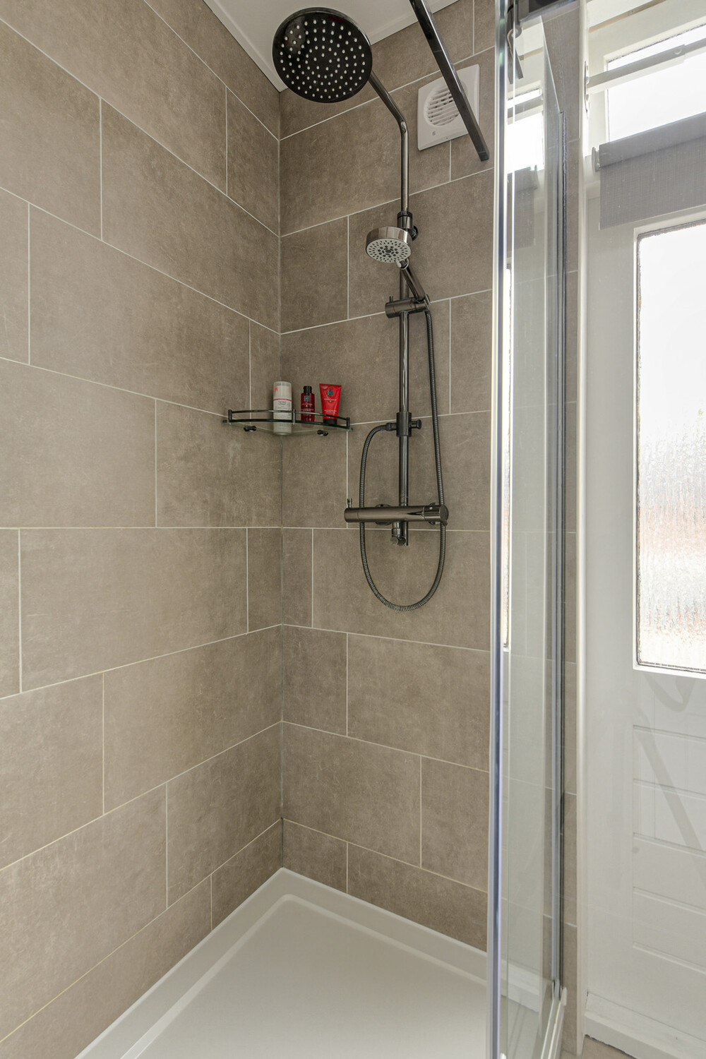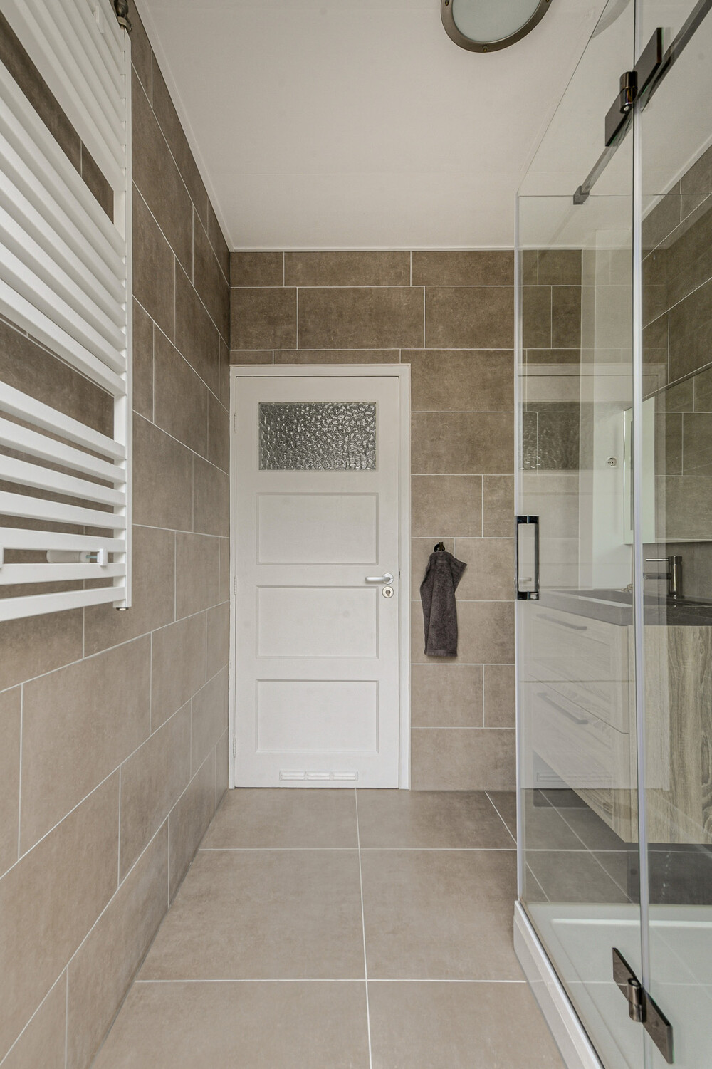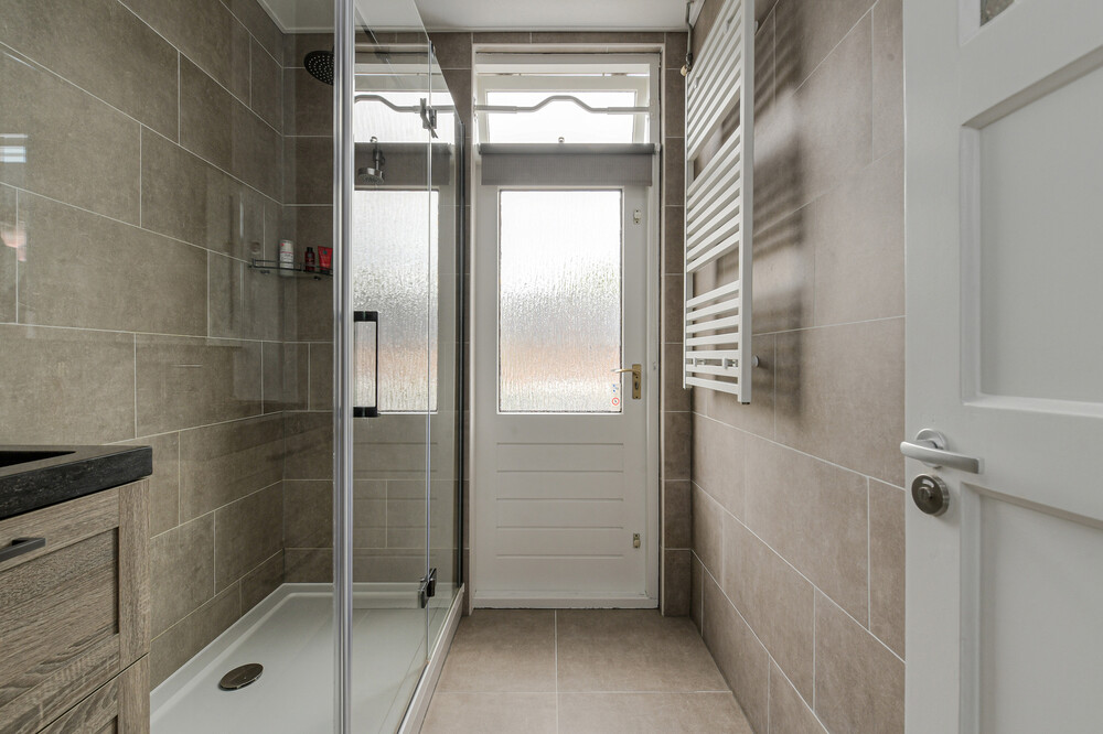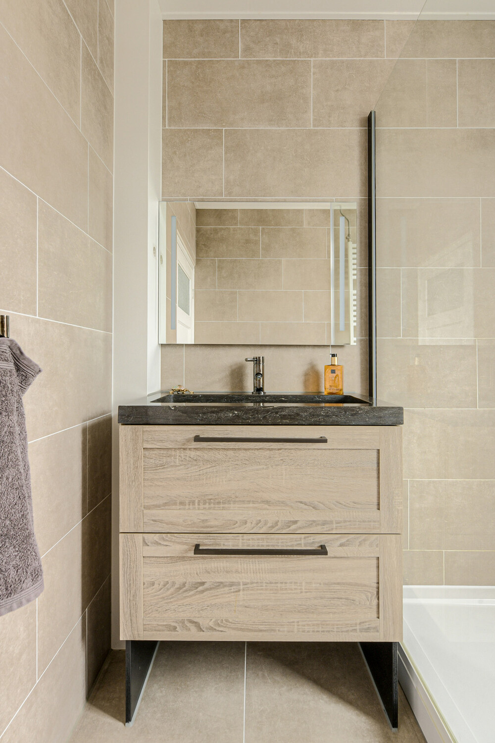 Moderne badkamer (ca. 1.85 x 2.20 m) gelegen aan de achterzijde, voorzien van een inloopdouche met regendouche, een wastafelmeubel met hardstenen wasbak alsmede een handdoekradiator en toegang tot plat dak.
