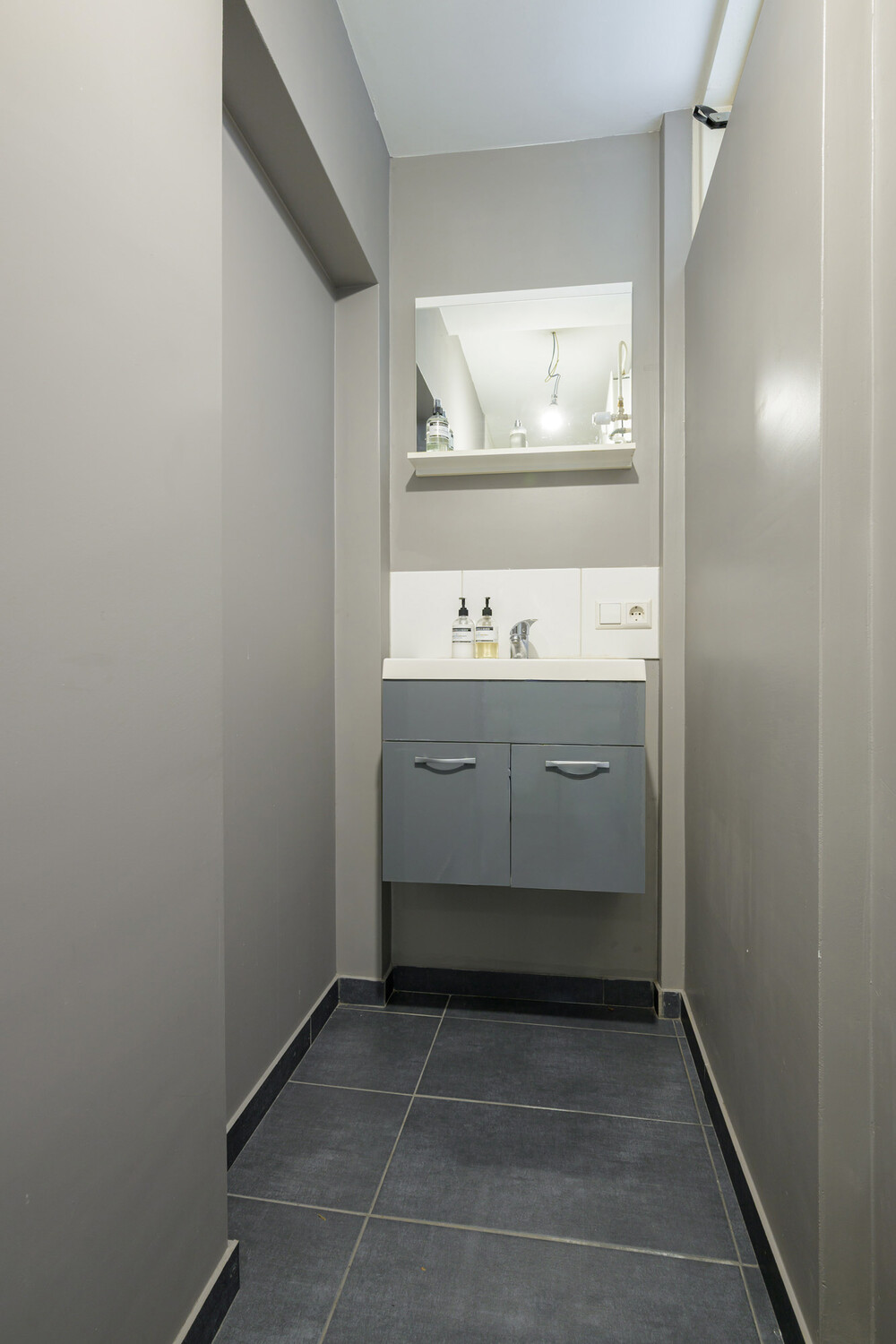 De badkamer is voorzien van een inloopdouche en een wastafel.