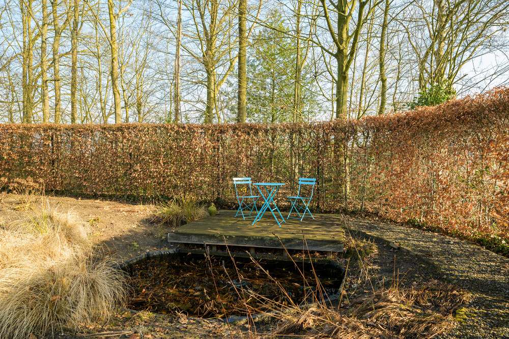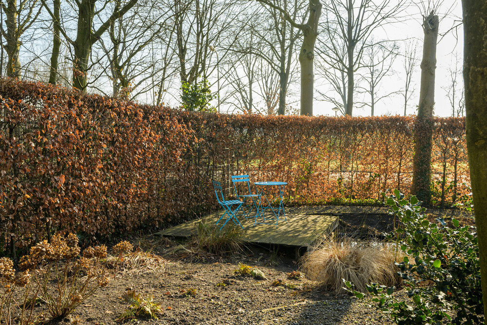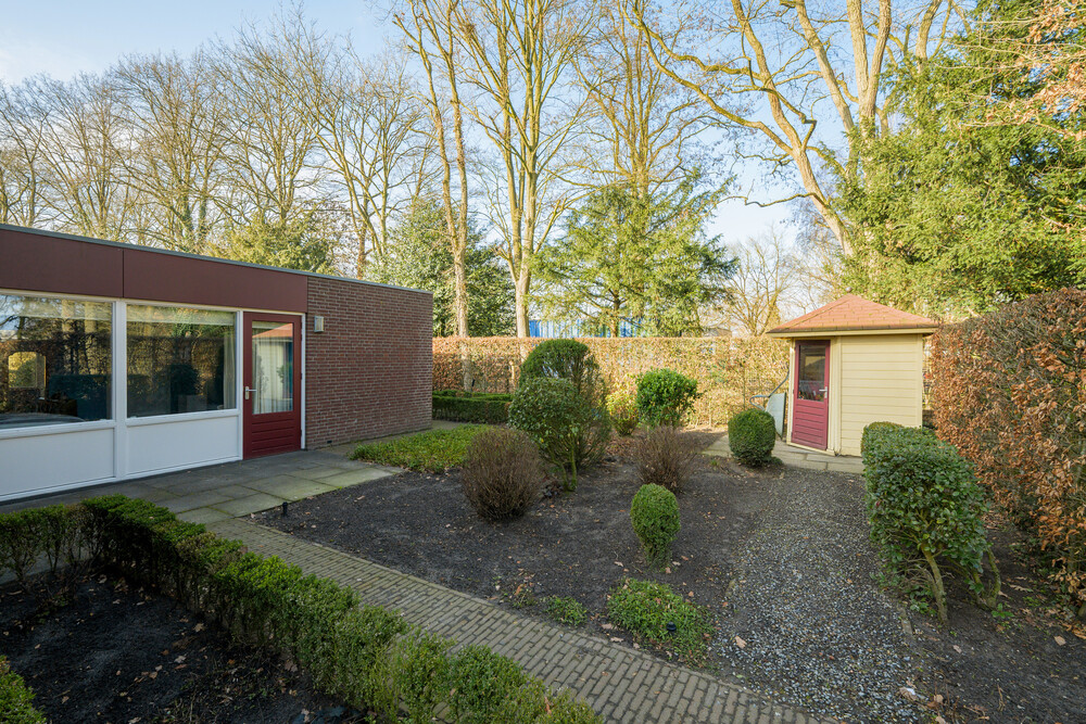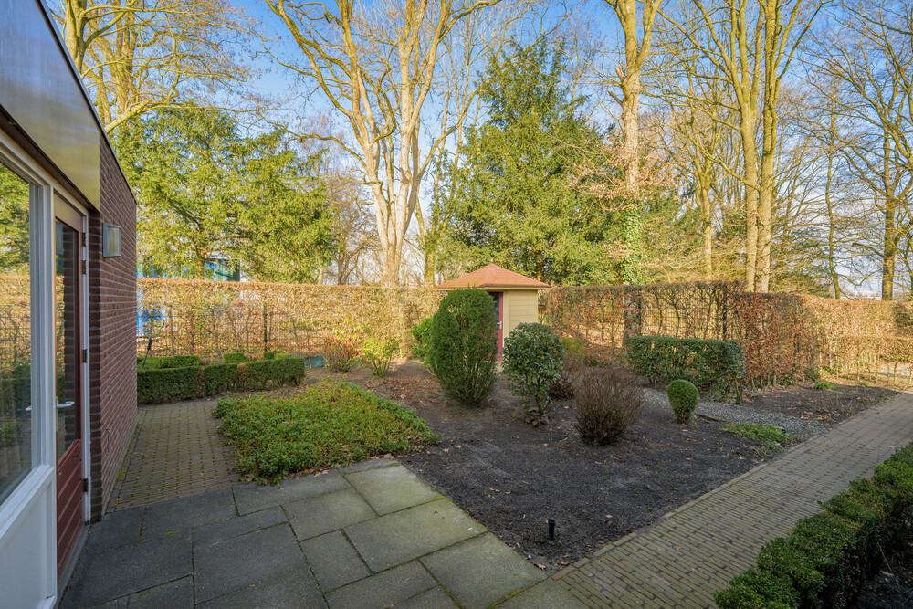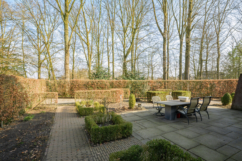 De royale tuin is gesitueerd op het zuiden en is fraai aangelegd en voorzien van bomen, diverse terrassen en plantenborders. De tuin is grotendeels omrasterd. Aan de voorzijde bevindt zich de oprit naar de woning en parkeergelegenheid voor meerdere auto's. In de tuin bevindt zich aan de achterzijde een houten berging.Garage/berging