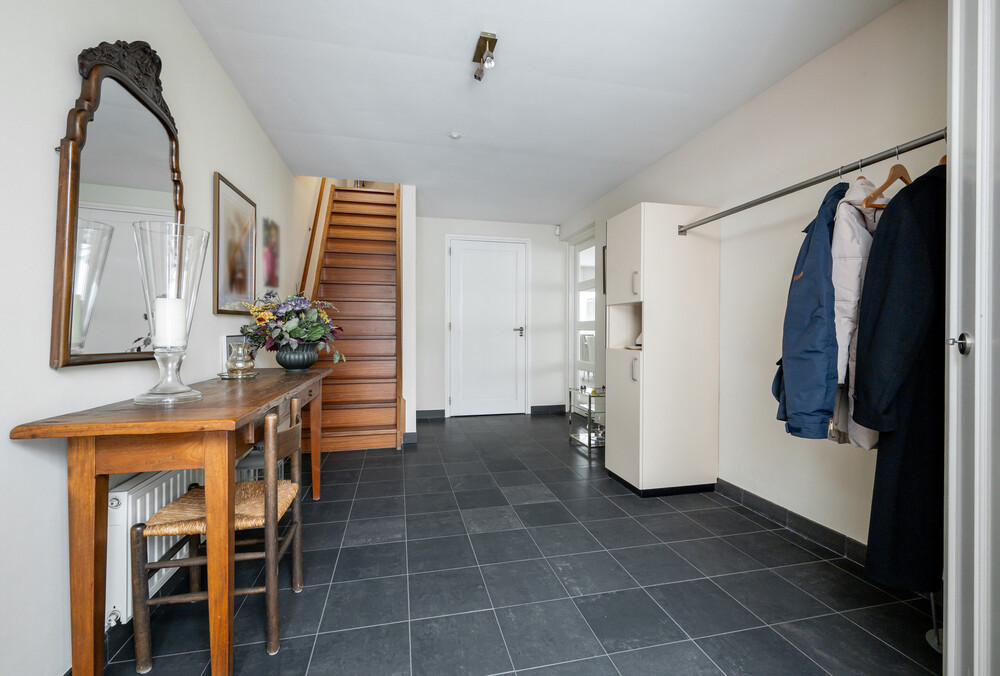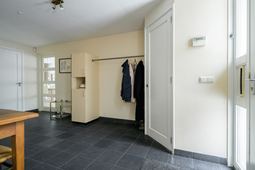 De ruime hal (ca. 2.80 x 5.40 m) is voorzien van een tegelvloer, garderobehoek met kastruimte, meterkast (14 groepen en 3 aardlekschakelaars), toegang tot gang en een trapopgang naar eerste verdieping.Toilet