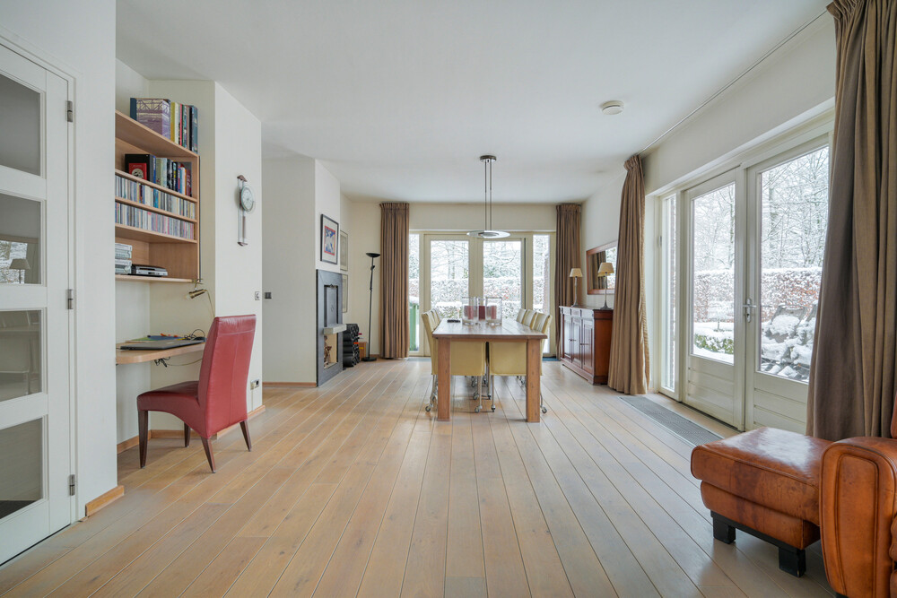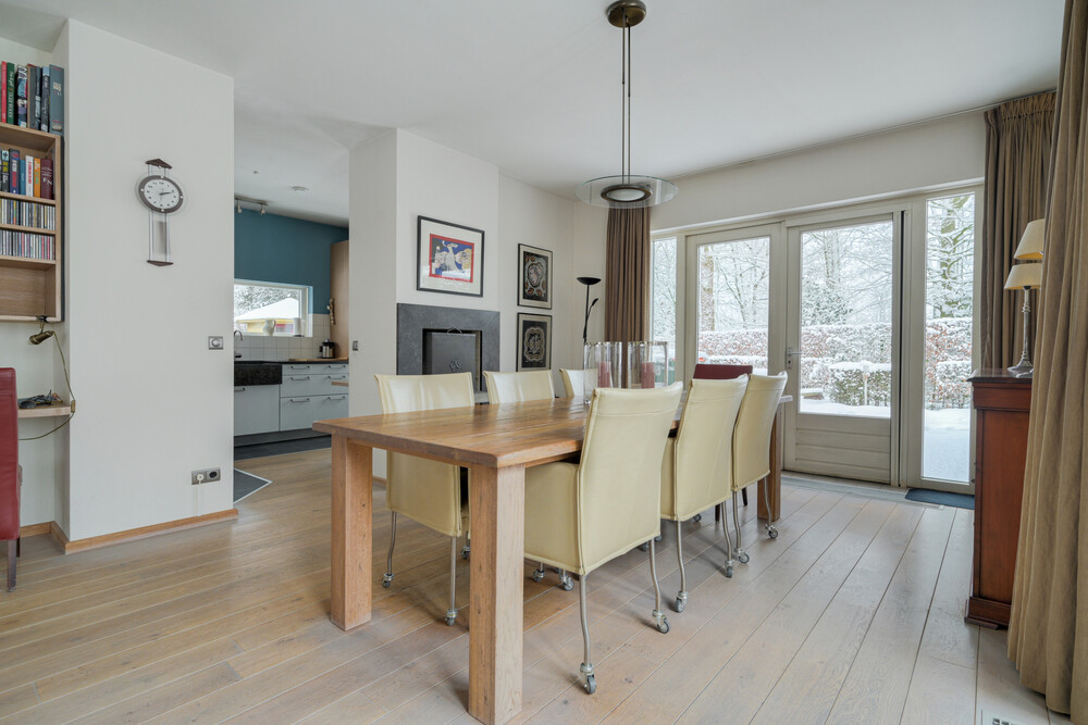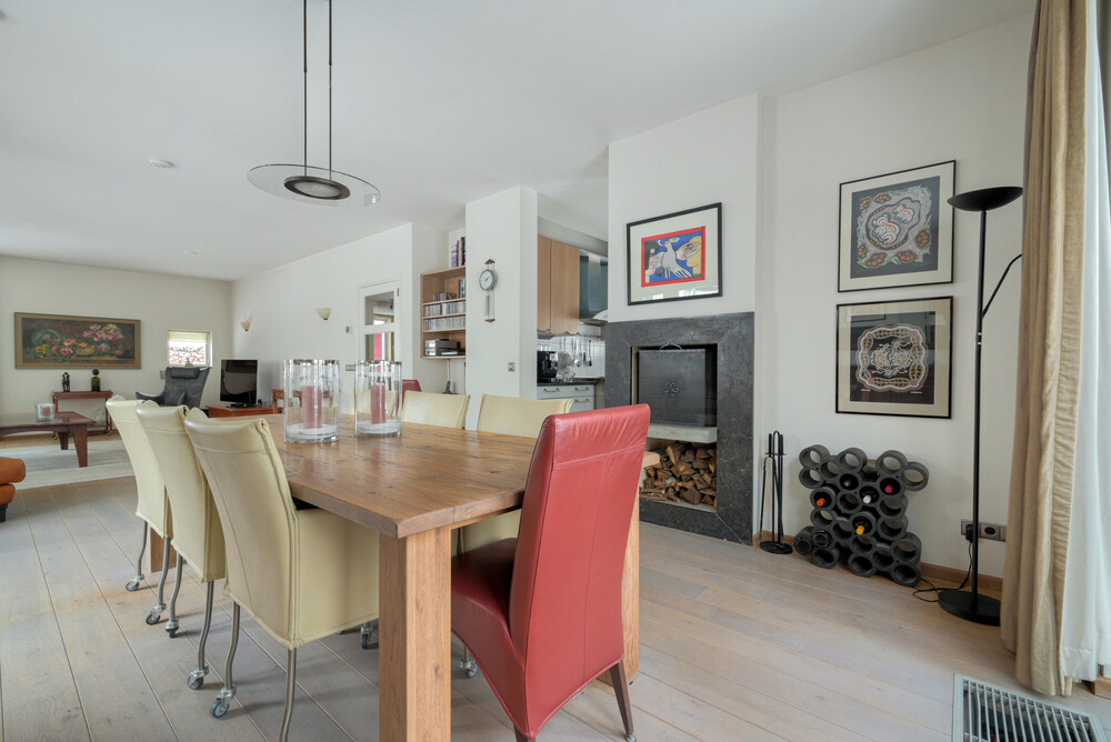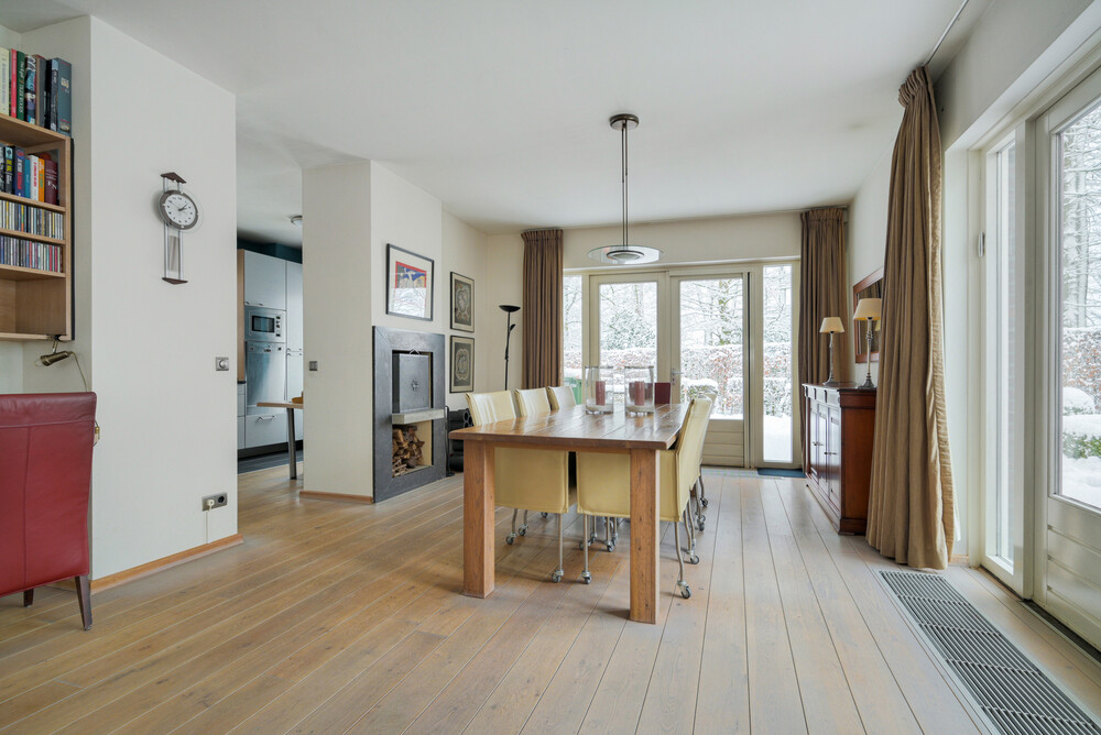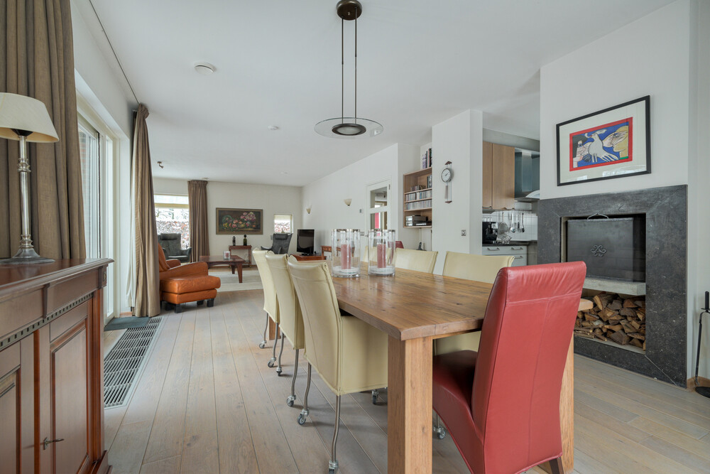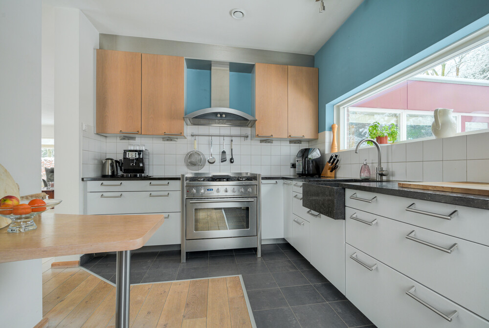 Ruime en speels ingedeelde op de tuin gerichte woonkamer in L-vorm (ca. 11.30 x 4.00/5.75 m), voorzien van een eikenhouten vloer, open haard en 2 x dubbele deuren naar de tuin. Vanuit de woonkamer een open verbinding naar de keuken.Keuken