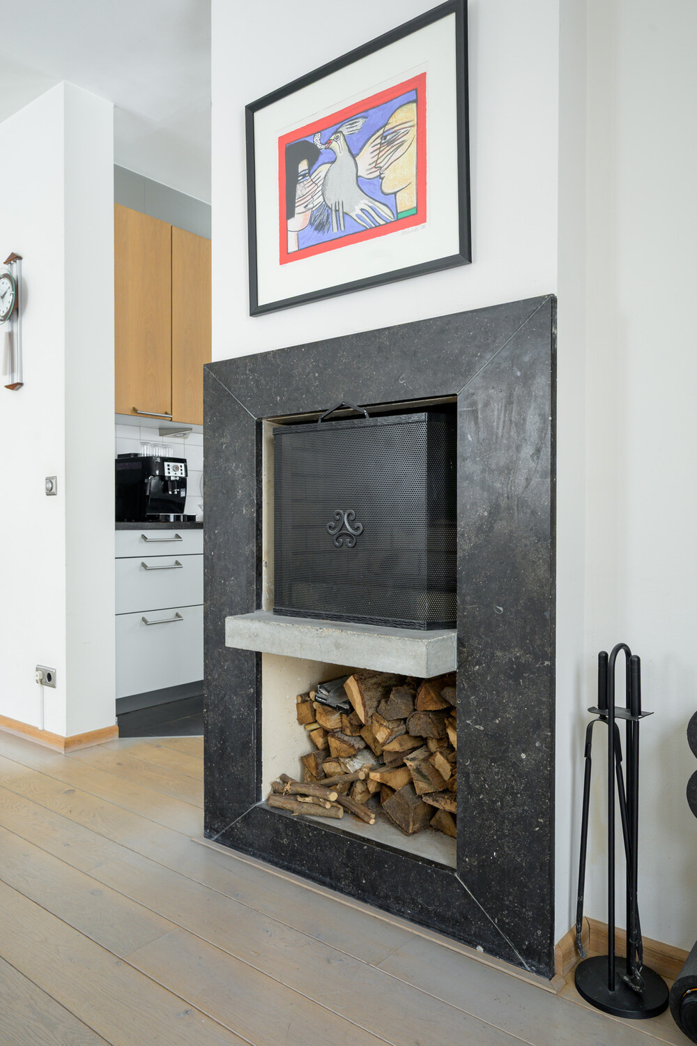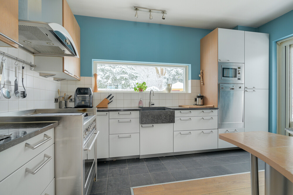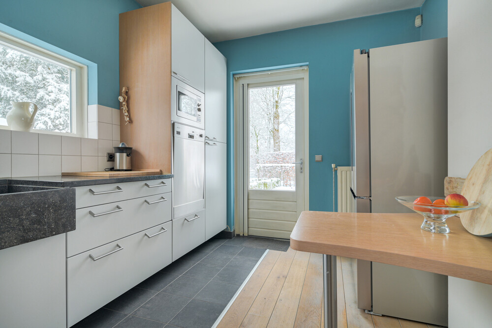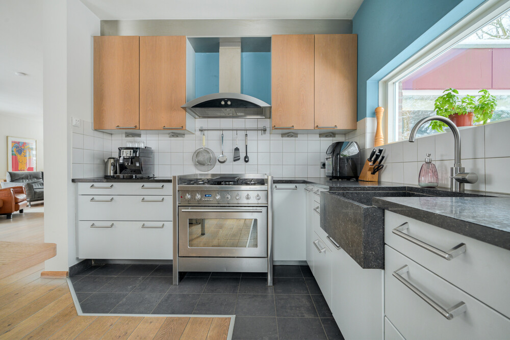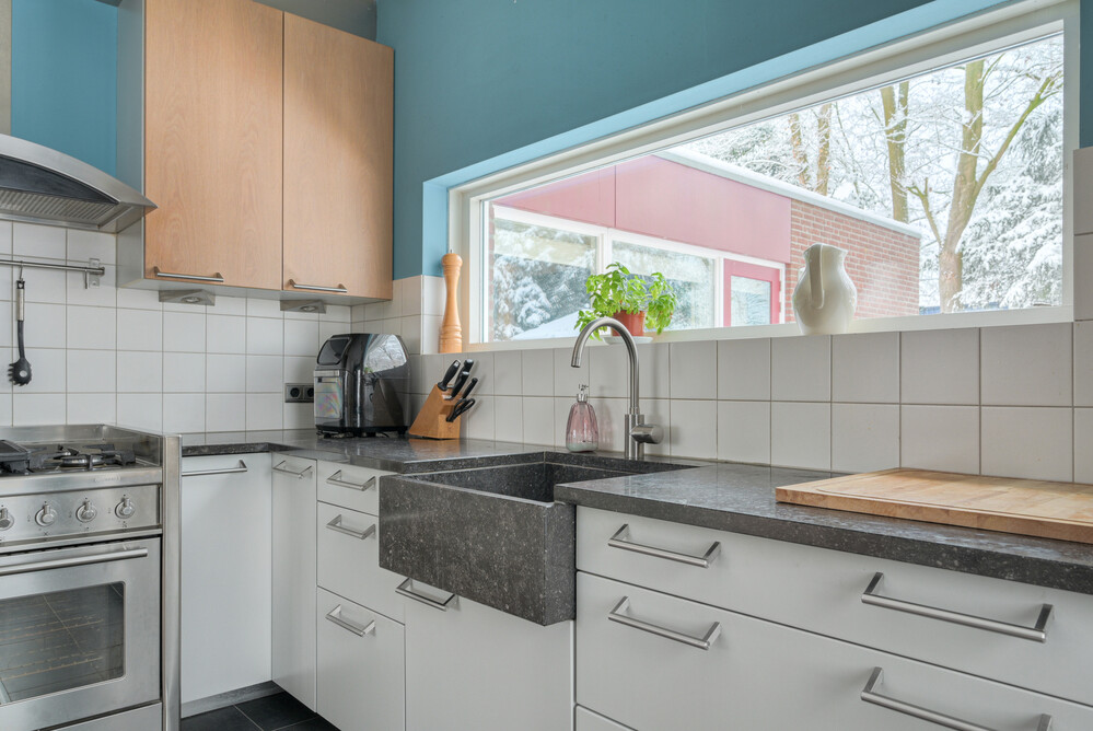 Ruime en speels ingedeelde op de tuin gerichte woonkamer in L-vorm (ca. 11.30 x 4.00/5.75 m), voorzien van een eikenhouten vloer, open haard en 2 x dubbele deuren naar de tuin. Vanuit de woonkamer een open verbinding naar de keuken.Keuken