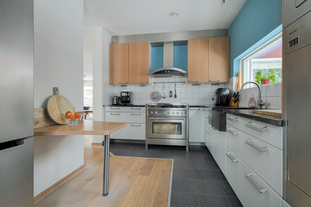 Keuken (ca. 2.80 x 4.15 m) aan de achterzijde met een moderne inrichting bestaande uit een aanrecht in hoekopstelling voorzien van een granieten blad met spoelbak, 5-pits gaskookplaat, elektrische oven, afzuigkap, vaatwasmachine, magnetron, een grote Amerikaanse koelkast met vriezer en diverse kasten en laden. Vanuit de keuken toegang tot de tuin.Gang