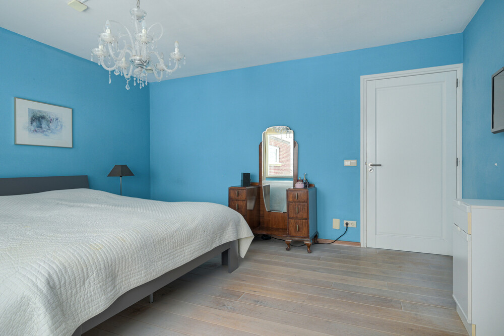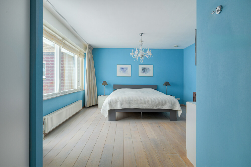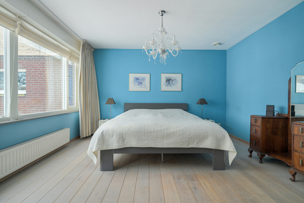 De ruime hoofdslaapkamer (ca. 4.25 x 4.50 m) is gelegen aan de achterzijde en is voorzien van een eikenhouten vloer, een stapdeur naar de tuin en een garderobehoek (ca. 2.10 x 2.35 m) met ingebouwde kasten en een stapdeur naar de eigen badkamer.Badkamer