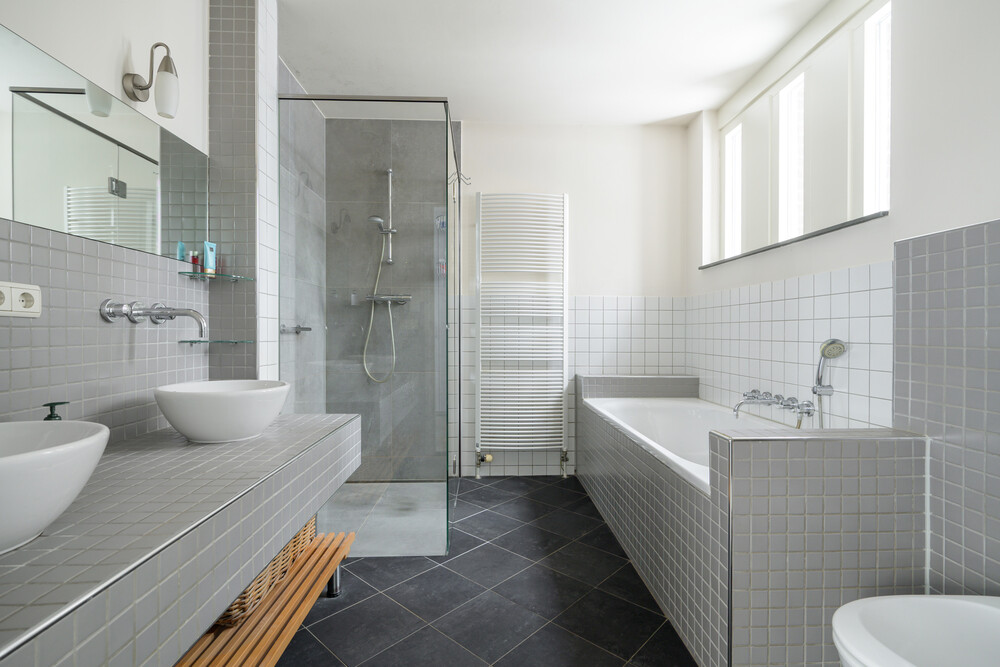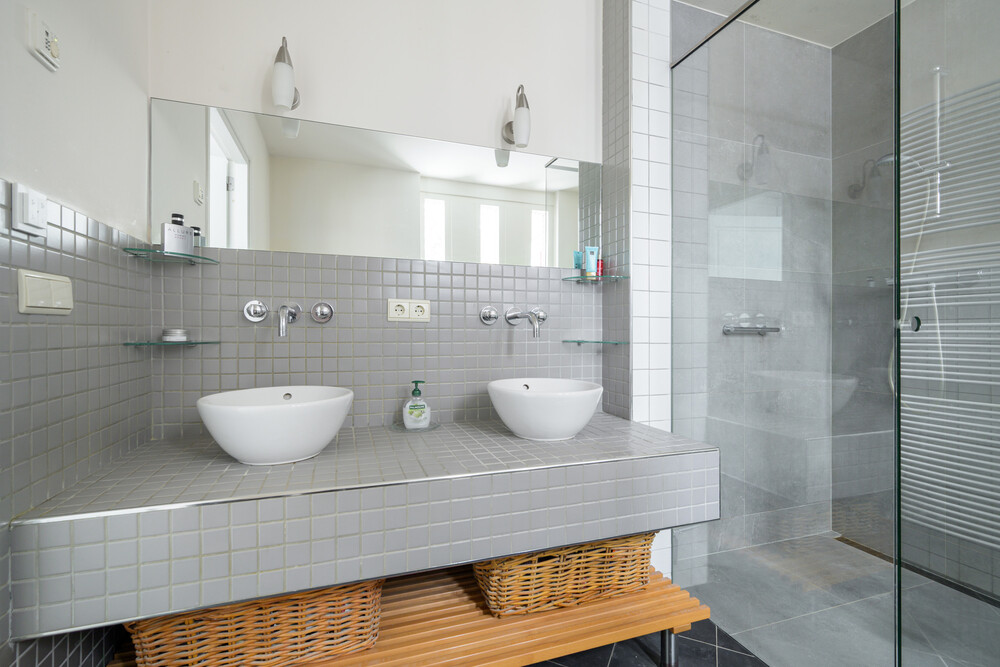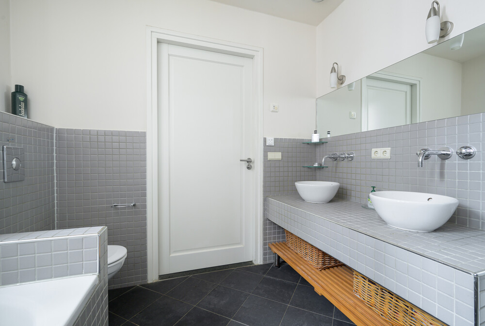 Ruime luxe badkamer (ca. 2.35 x 3.35 m) met ligbad voorzien van design kranen, een inloopdouche met thermostaatkraan en hardglazen douchescherm, een badkamermeubel met 2 waskommen, design kranen en een spiegel, een wandcloset met inbouwreservoir, een handdoekradiator en vloerverwarming.Bijkeuken