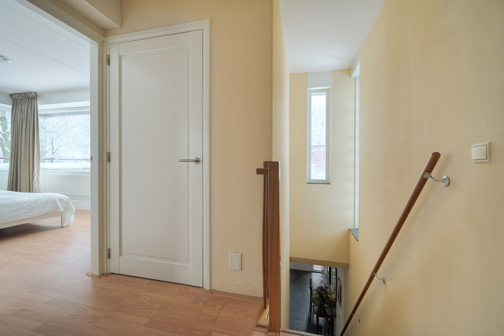 Ruime overloop met laminaatvloer en toegang tot slaapkamers, badkamer en berging.Berging