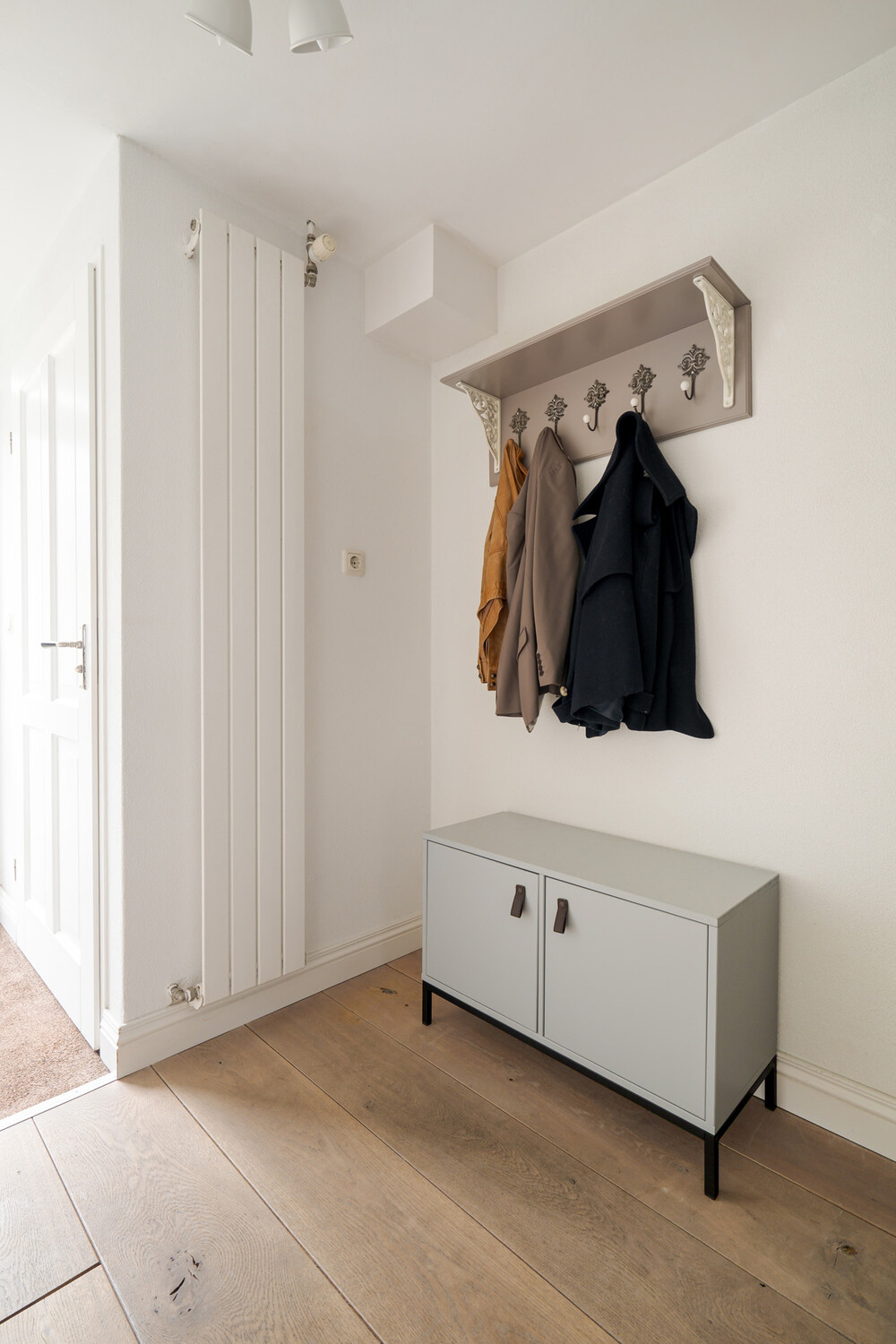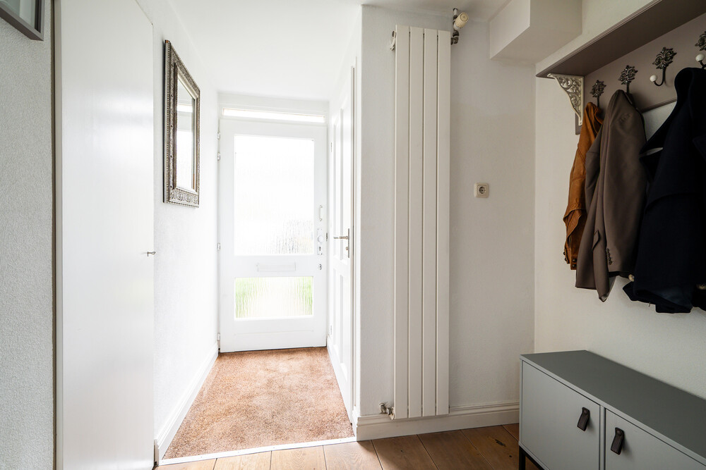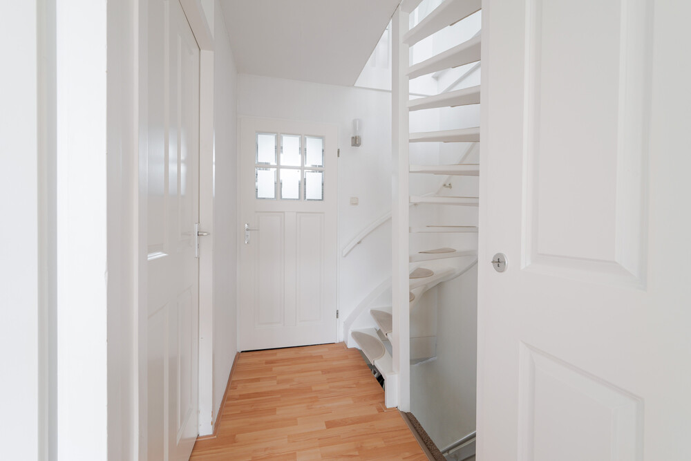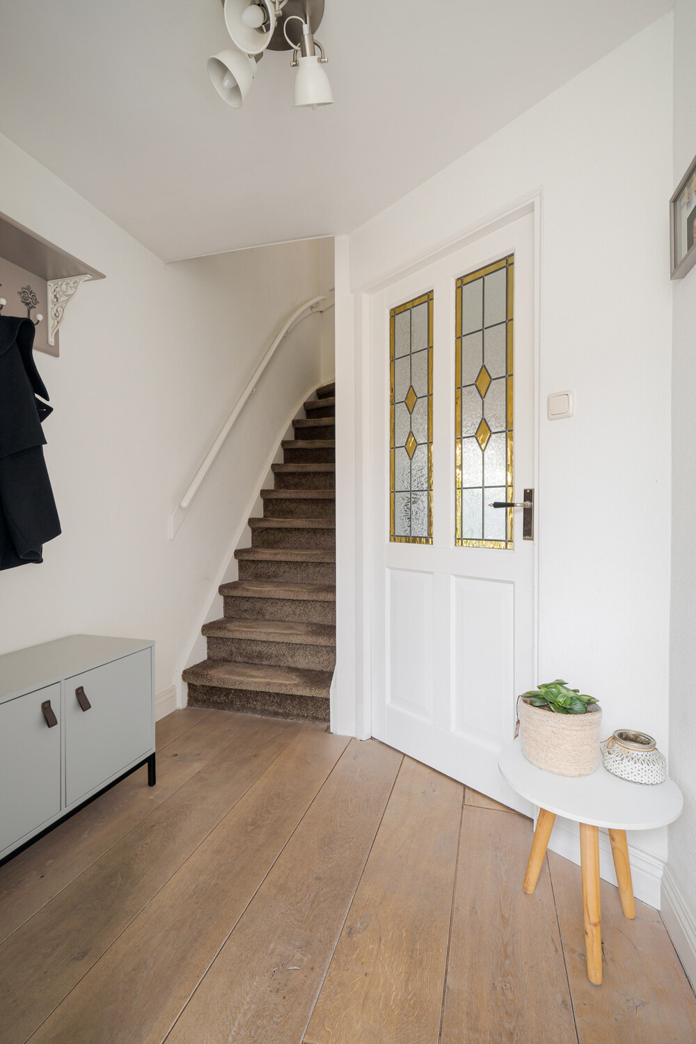 Entree in hal/gang met meterkast (8 groepen, 2 aardlekschakelaars en een PV-groep), garderobenis en een trapopgang naar de eerste verdieping.Toilet