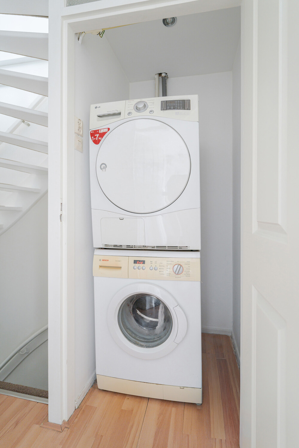 Overloop met kast waarin de aansluitingen t.b.v. de wasapparatuur en een trapopgang naar tweede verdieping.Slaapkamer i