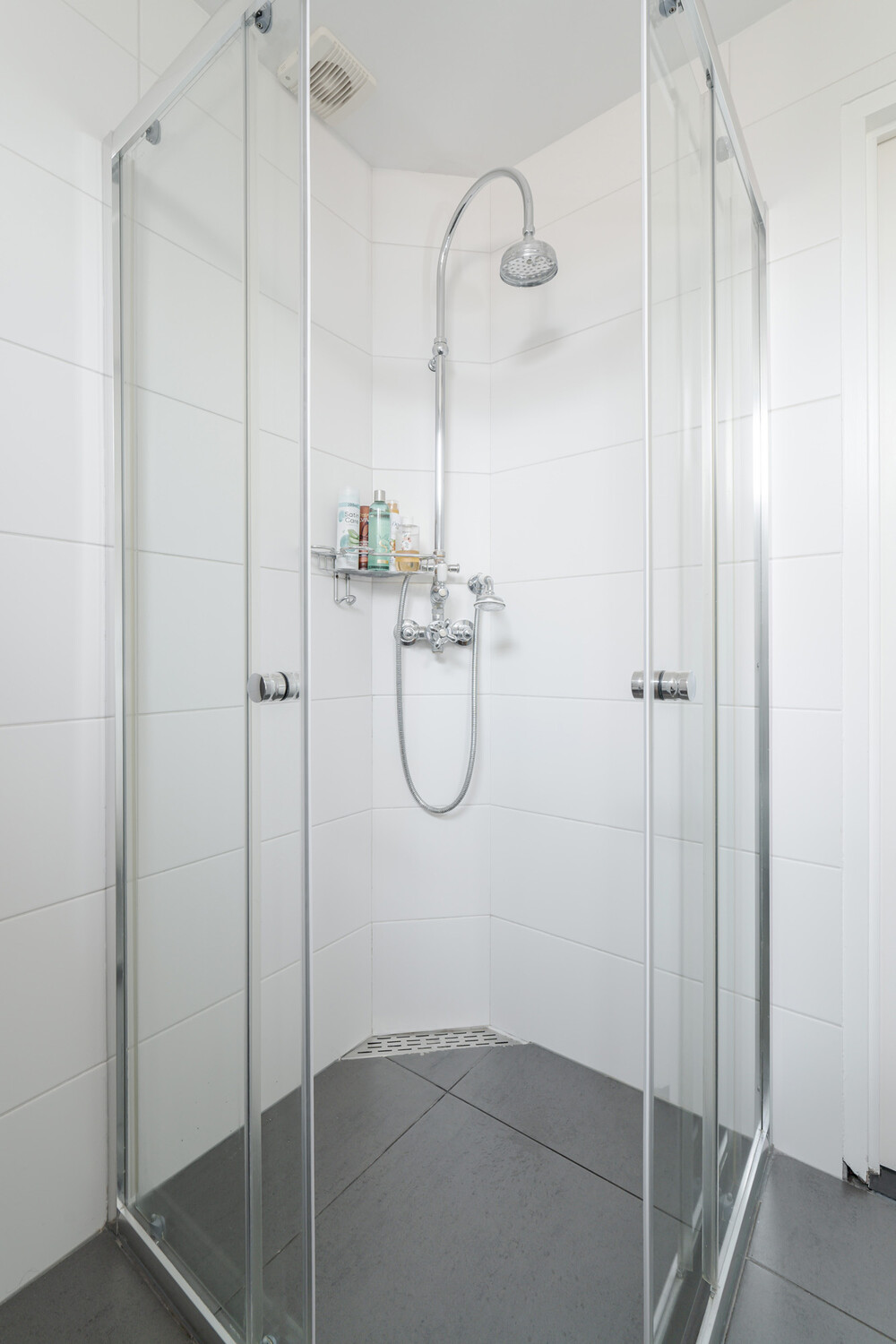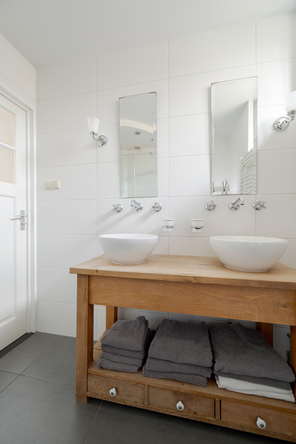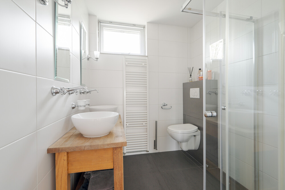 Betegelde badkamer aan de voorzijde (ca. 1.90 x 2.20 m.) voorzien van inloopdouche met hardglazen deur, badkamermeubel met 2 waskommen, een 2e wandcloset met inbouwreservoir en een handdoekradiator.