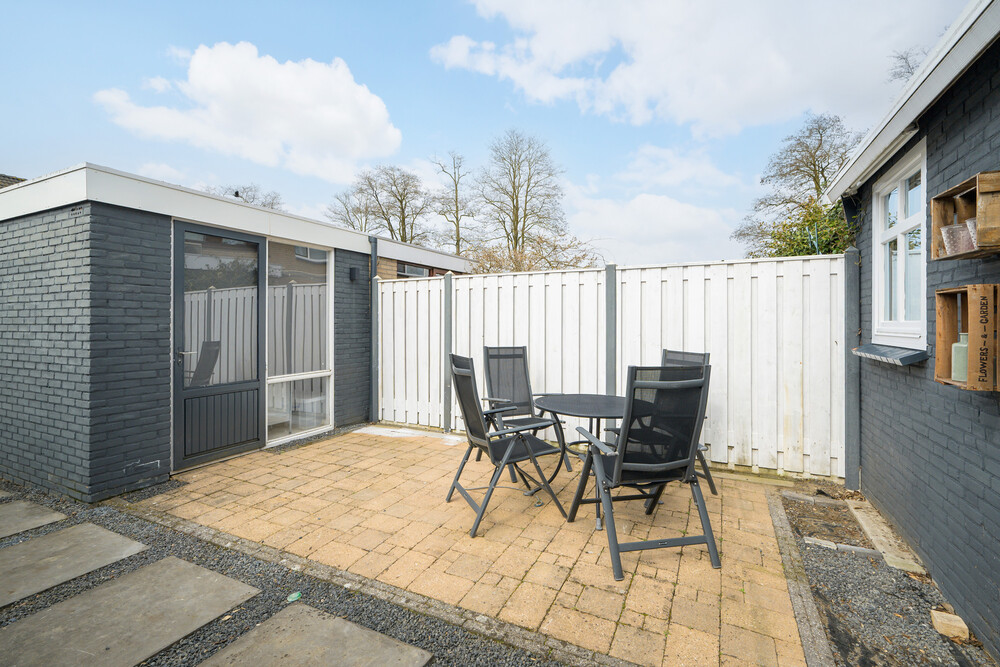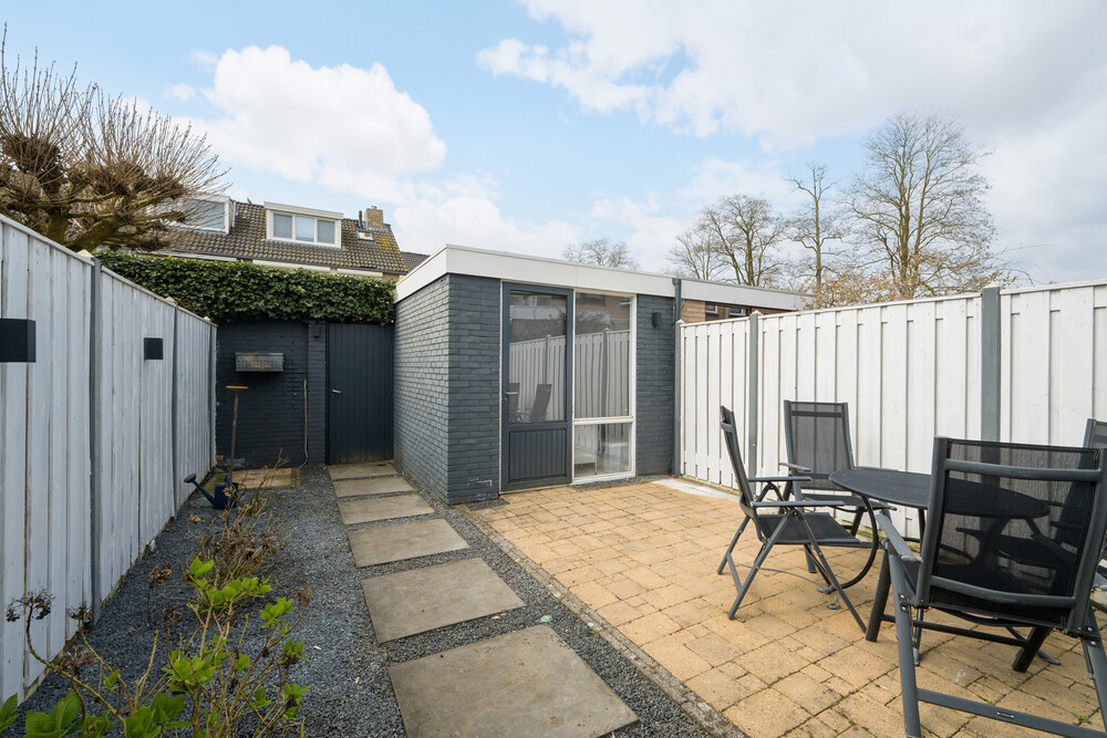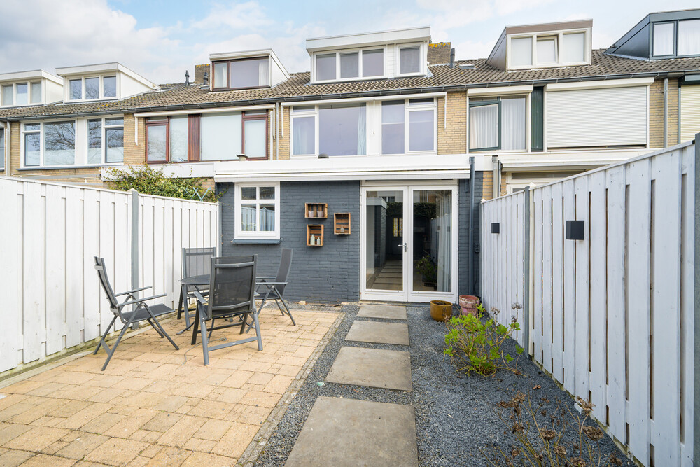 De achtertuin (ca. 5.00 x 8.00 m.) is gesitueerd op het westen en is aangelegd met een betegeld terras en grindborders. In deze tuin bevindt zich een stenen berging (ca. 2.70 x 2.80 m.) voorzien van elektra. De achtertuin is bereikbaar via een achterom.