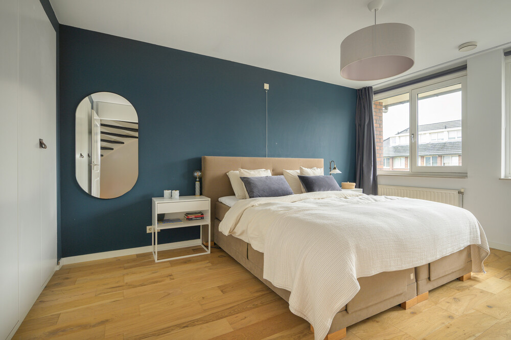 Zeer ruime hoofdslaapkamer, aan de achterzijde gelegen. In deze kamer is een ruime, op maat gemaakte kledingkast geplaatst.Badkamer