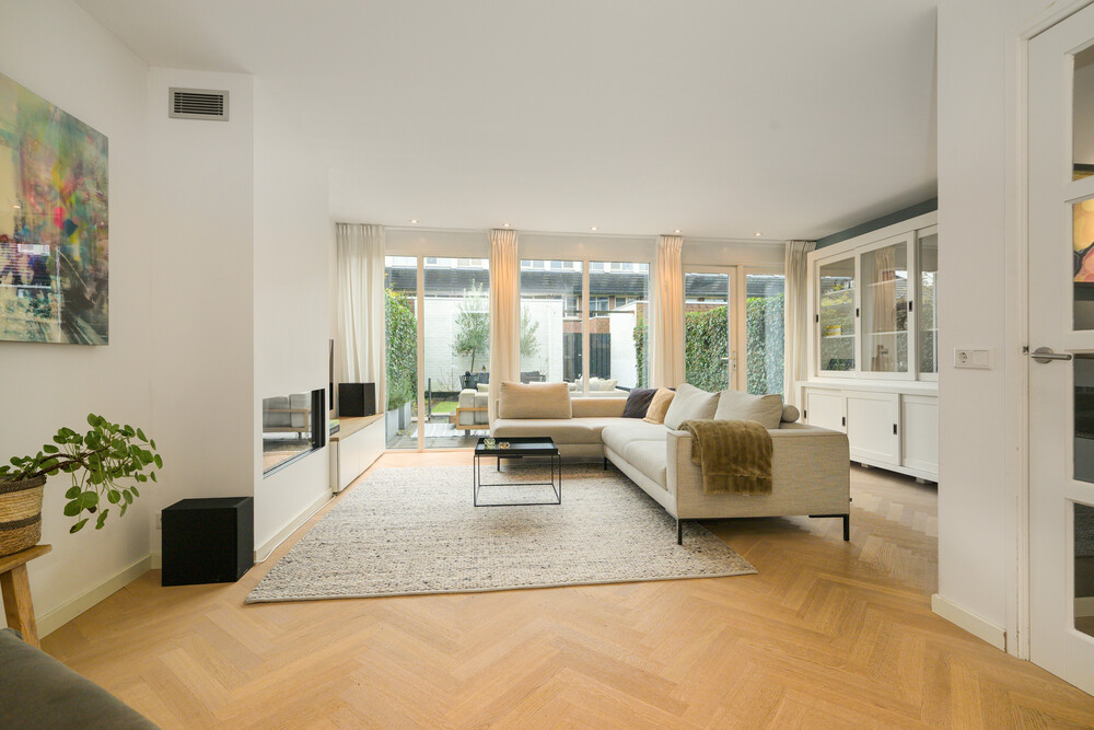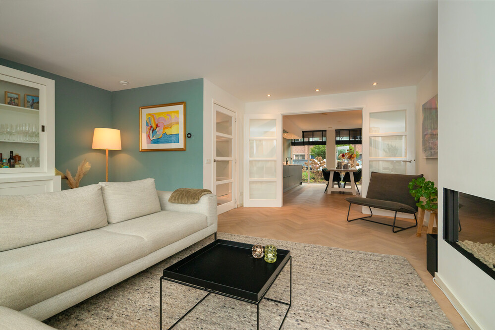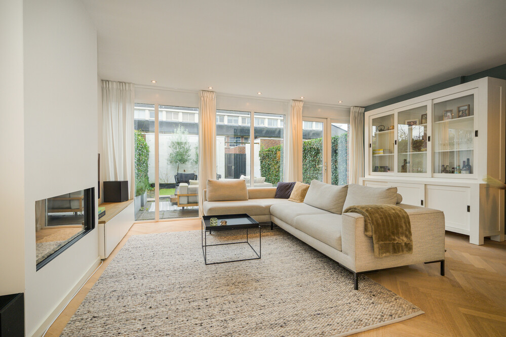 Grote L-vormige tuingerichte woonkamer met mooie lichtinval door de grote glaspartij. In deze kamer is een strakke schouw met gashaard aanwezig, openslaande deuren verbinden deze kamer met de tuin.Woon-/eetkeuken