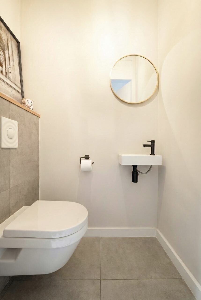 Toiletruimte met fraaie betegeling, een wandcloset met inbouwreservoir en een fonteintje.Trapkast