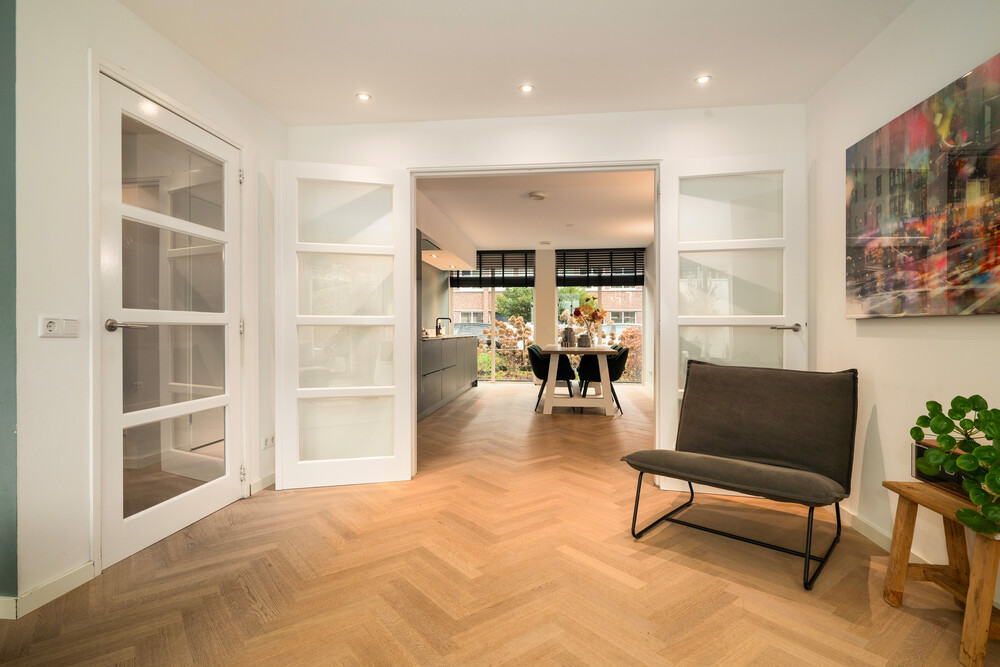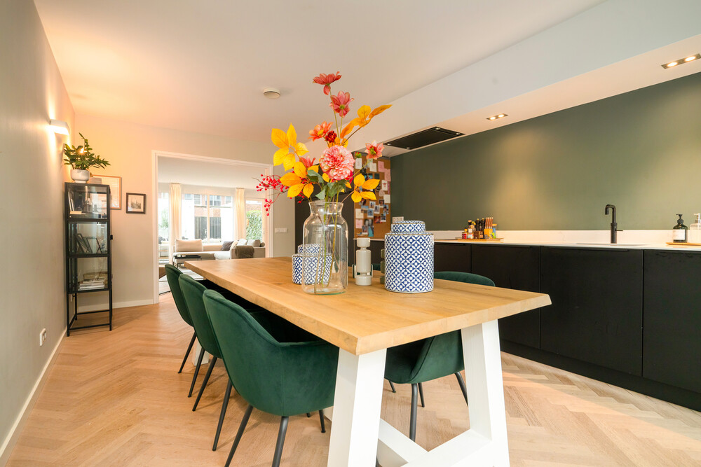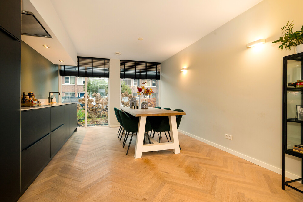 De zeer ruime woon-eetkeuken is aan de voorzijde gesitueerd. De keukenindeling bestaat uit een composiet blad met rvs-spoelbak, een inductiekookplaat waarboven een afzuigkap, een vaatwasser, een koelkast, een vriezer, een heteluchtoven, een magnetron en veel kastruimte.De gehele begane grond vloer is uitgevoerd met licht eiken parket in visgraatpatroon, voorzien van vloerverwarming, de wanden en plafonds zijn voorzien van strak stucwerk. Tussen de ruime woon/leefkeuken en de woonkamer zijn houten en-suite deuren aanwezig. In de plafonds zijn op meerdere plaatsen inbouwspots geplaatst.