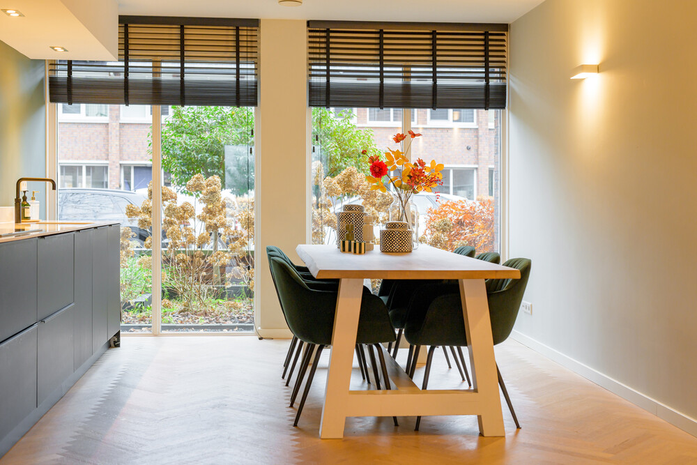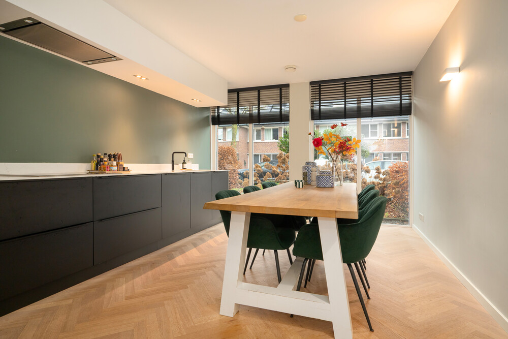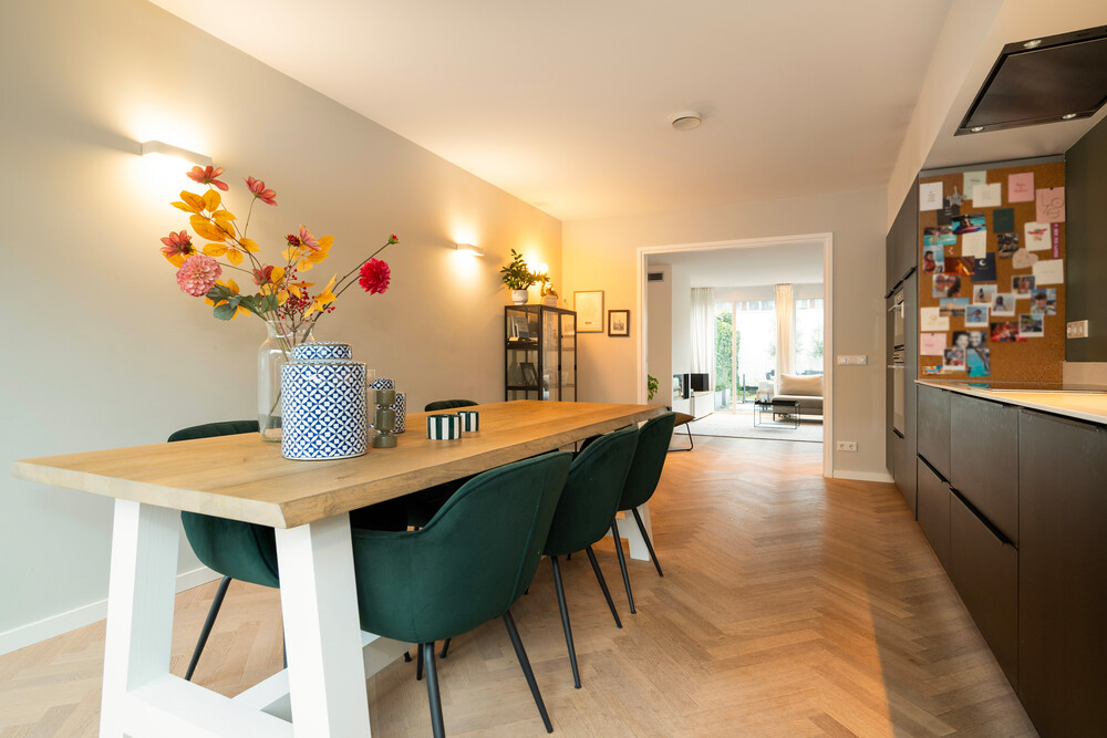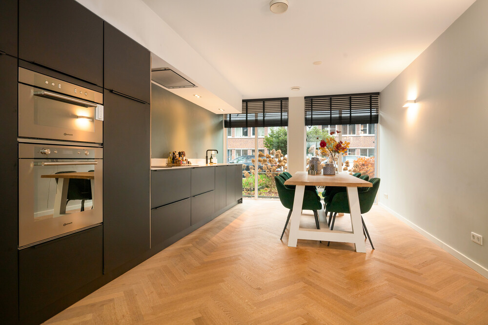 De zeer ruime woon-eetkeuken is aan de voorzijde gesitueerd. De keukenindeling bestaat uit een composiet blad met rvs-spoelbak, een inductiekookplaat waarboven een afzuigkap, een vaatwasser, een koelkast, een vriezer, een heteluchtoven, een magnetron en veel kastruimte.De gehele begane grond vloer is uitgevoerd met licht eiken parket in visgraatpatroon, voorzien van vloerverwarming, de wanden en plafonds zijn voorzien van strak stucwerk. Tussen de ruime woon/leefkeuken en de woonkamer zijn houten en-suite deuren aanwezig. In de plafonds zijn op meerdere plaatsen inbouwspots geplaatst.