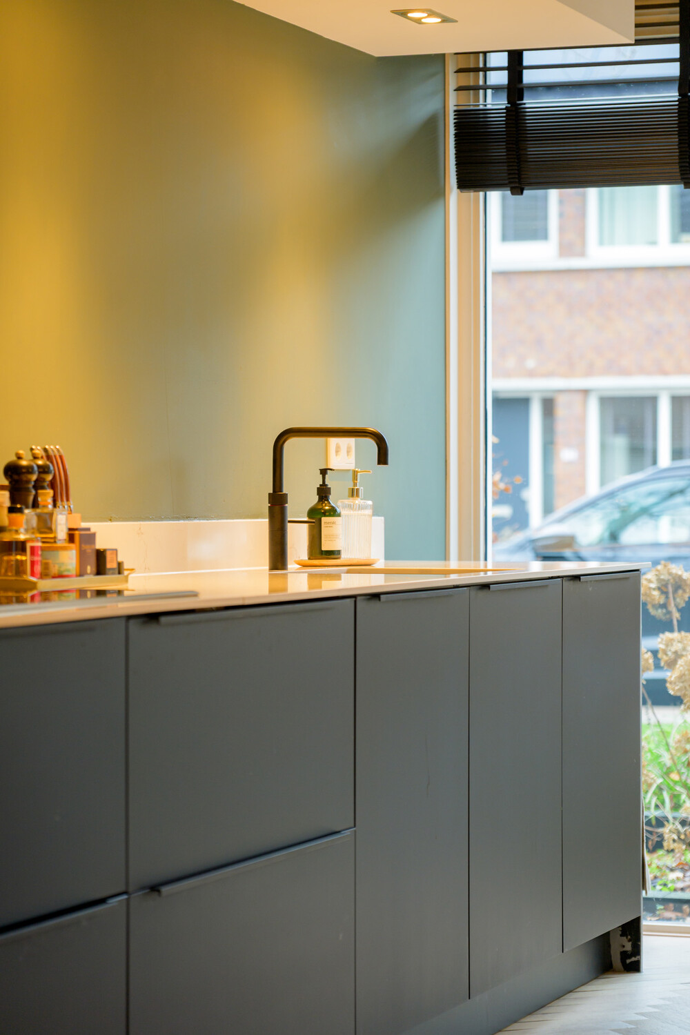 Grote L-vormige tuingerichte woonkamer met mooie lichtinval door de grote glaspartij. In deze kamer is een strakke schouw met gashaard aanwezig, openslaande deuren verbinden deze kamer met de tuin.Woon-/eetkeuken