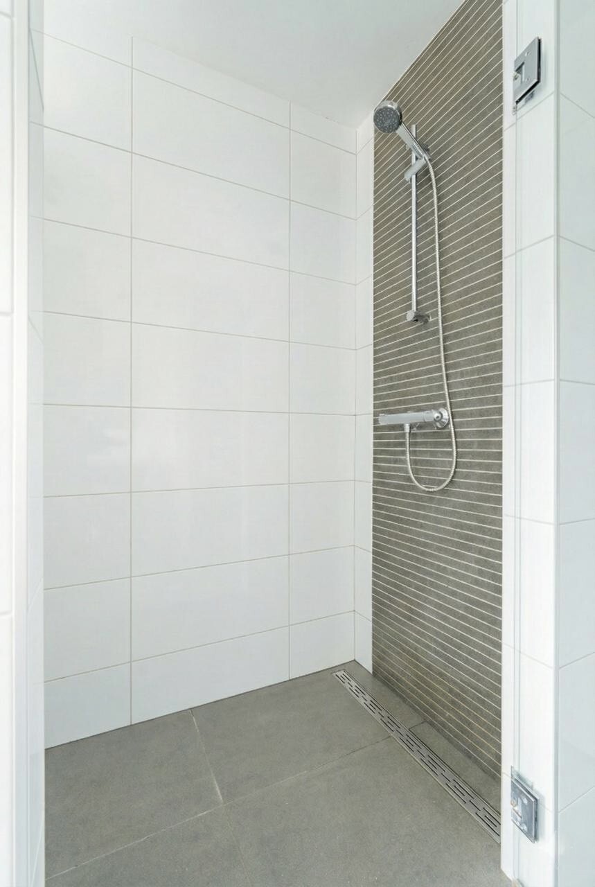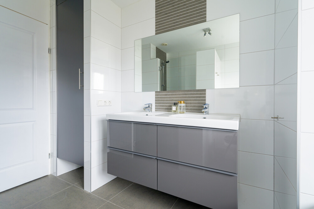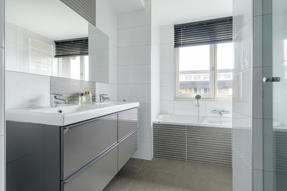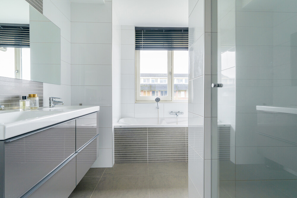 Badkamer met moderne inrichting. De wanden en vloer zijn geheel voorzien van grijs/witte betegeling. Voorts tref je in deze badkamer een ligbad met thermostaatkraan, een wandcloset met inbouwreservoir, een ruime inloopdouche met thermostaatkraan, een wastafelmeubel met dubbele wastafel en een grote inbouwkast.De eerste verdieping is geheel voorzien van een eiken lamel-parketvloer.
