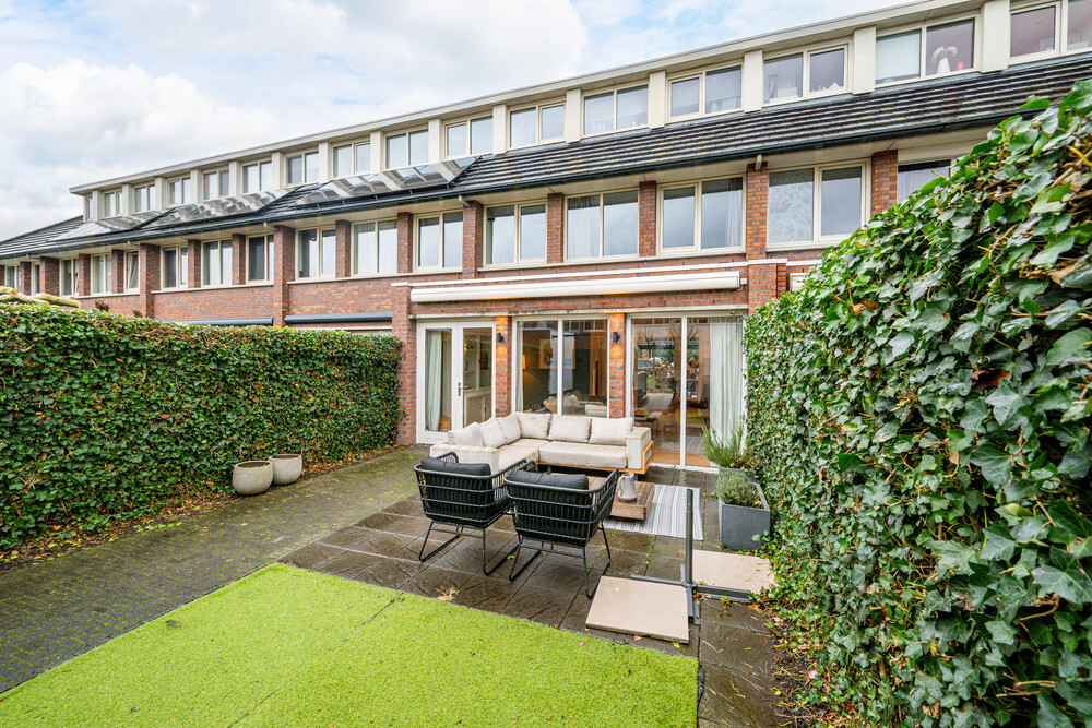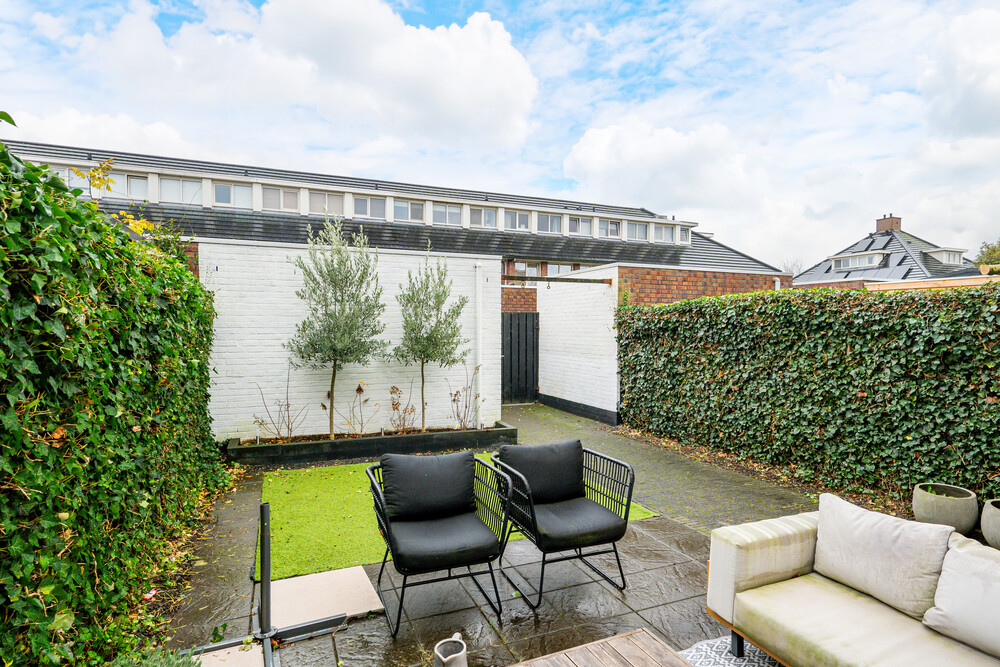 De sfeervolle, onderhoudsvriendelijke tuin is op het zuiden gelegen. Tegen de woning is een terras in betontegels gesitueerd, de overige bestrating is in klinkers uitgevoerd. In de borders is variërende beplanting aanwezig.Daarnaast; een gazon (in kunstgras uitgevoerd).