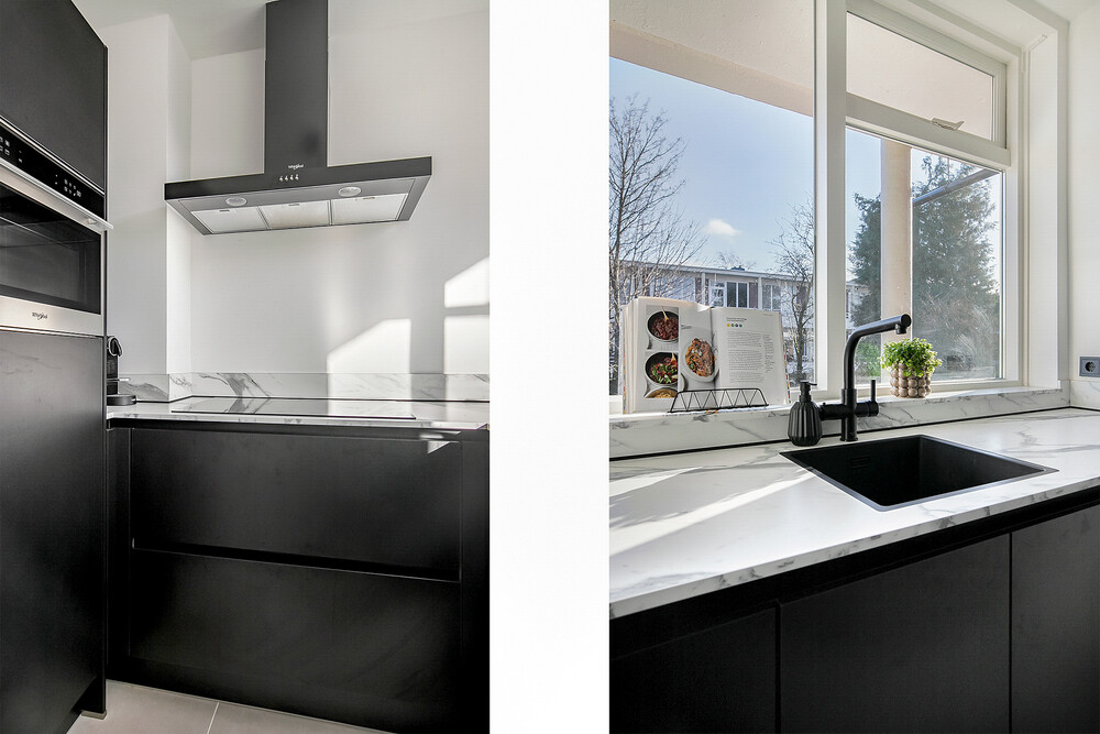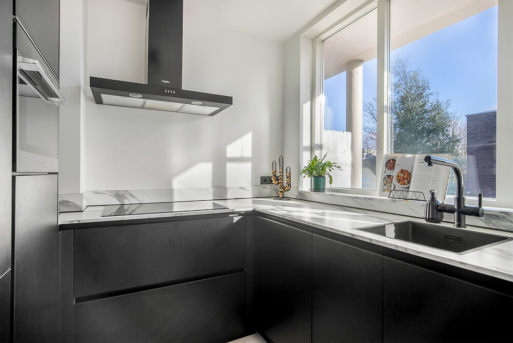Koken met plezierDe moderne keuken is uitgevoerd in een U-opstelling en voorzien van diverse inbouwapparatuur, waaronder een inductiekookplaat, rvs afzuigkap, oven, vaatwasser, koelkast, kokend water kraan en een rvs spoelbak. Of je nu snel iets klaarmaakt of uitgebreid kookt voor vrienden: hier kan het allemaal. Dankzij de strakke afwerking en de complete inbouwapparatuur kook je hier met gemak én plezier.