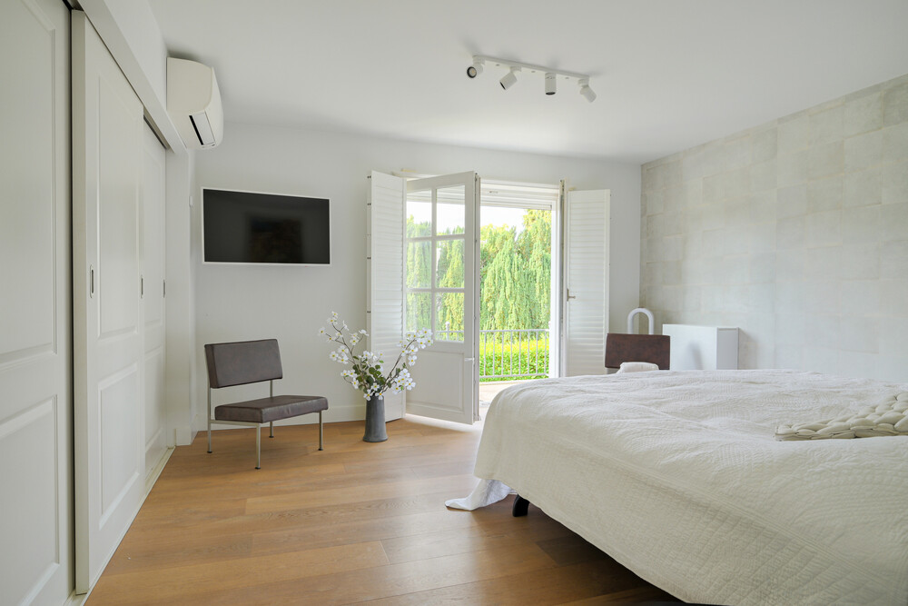 Ruime voorslaapkamer met Frans balkon en extra ruimtelijk effect doordat de kapconstructie in het zicht gebleven is. In deze kamer tref je een entresol/hoogslaper. Bovendien is deze kamer voorzien van airconditioning.Grote vaste kast waarin aansluitpunten ten behoeve van wasmachine en droger.