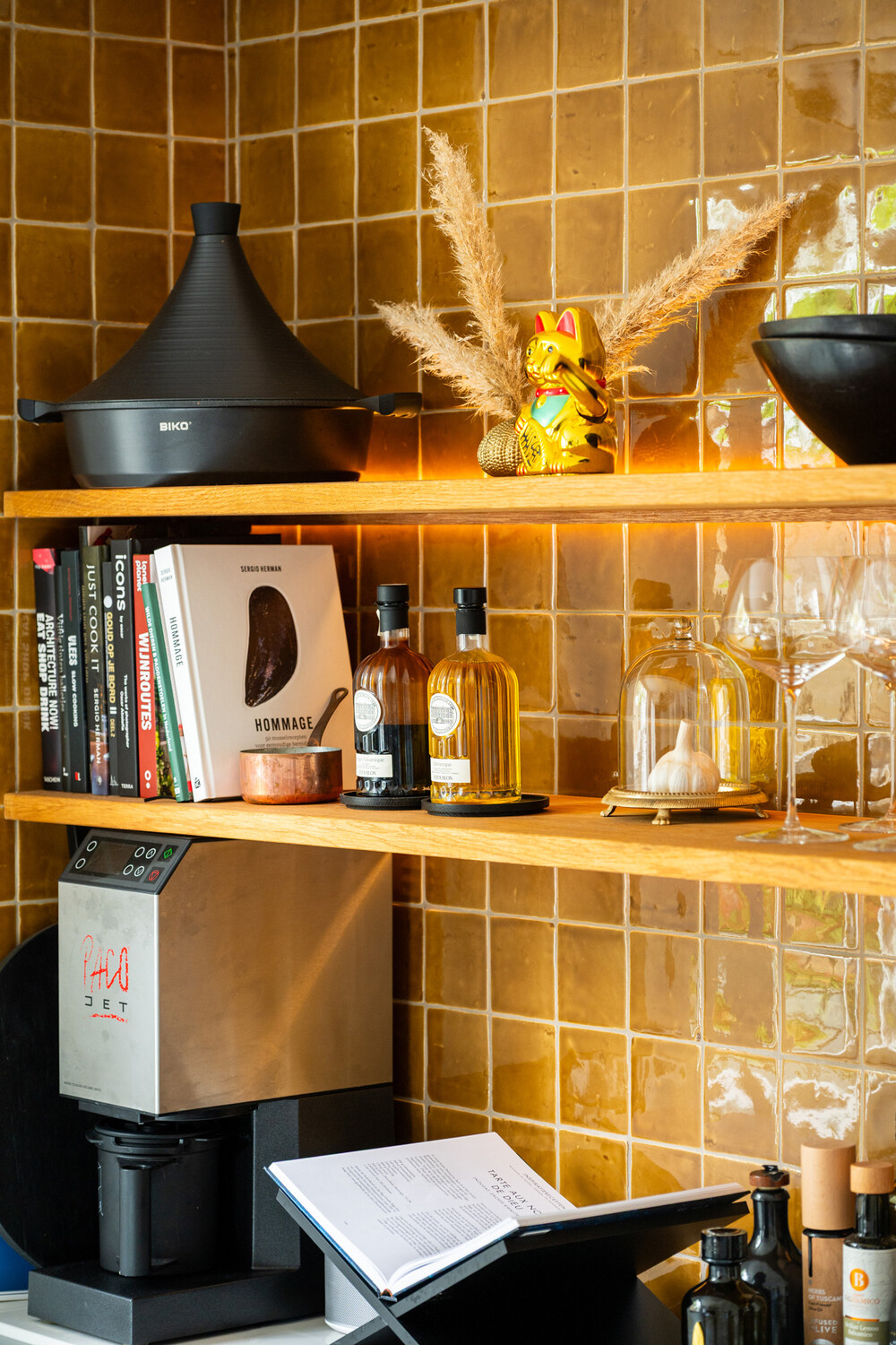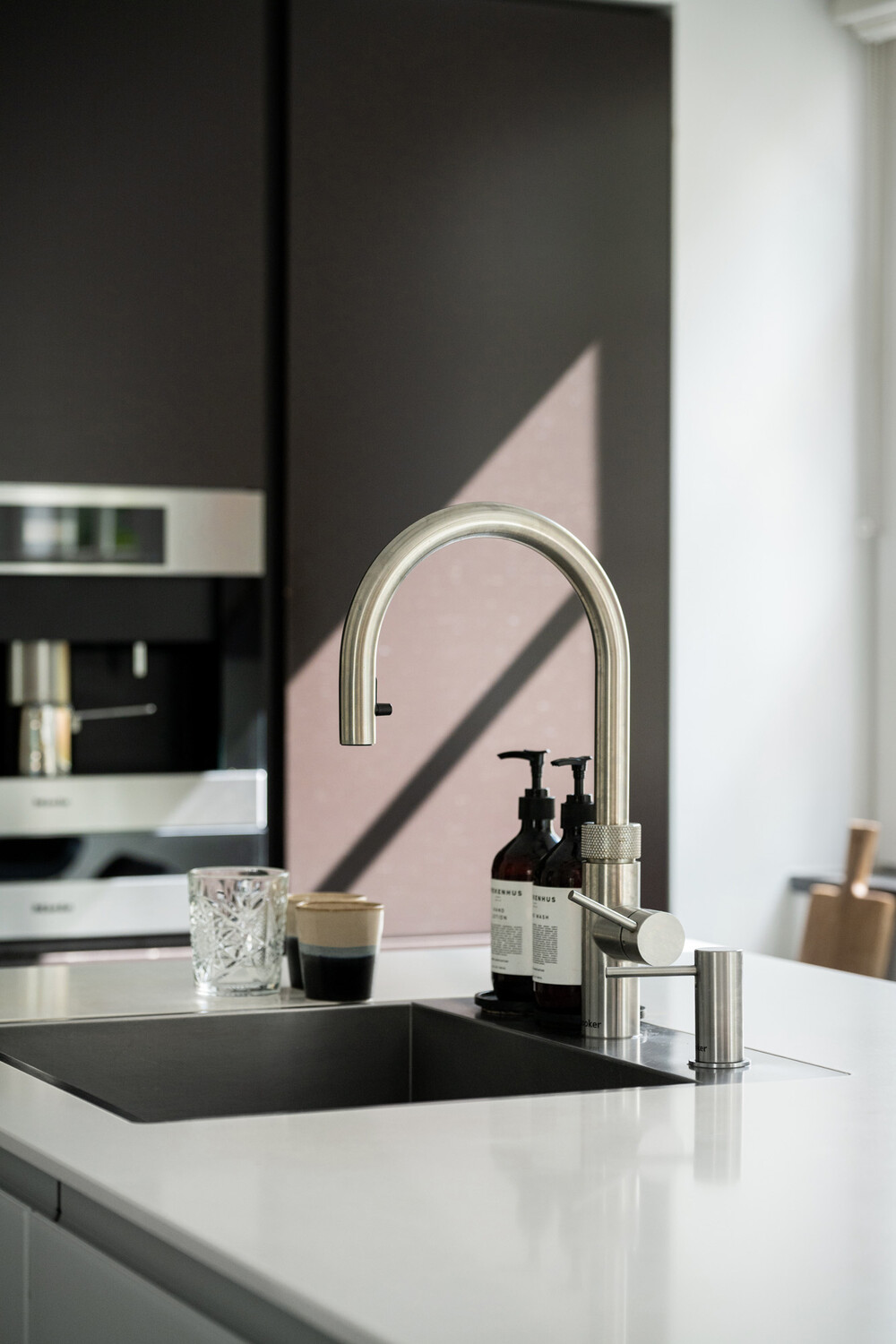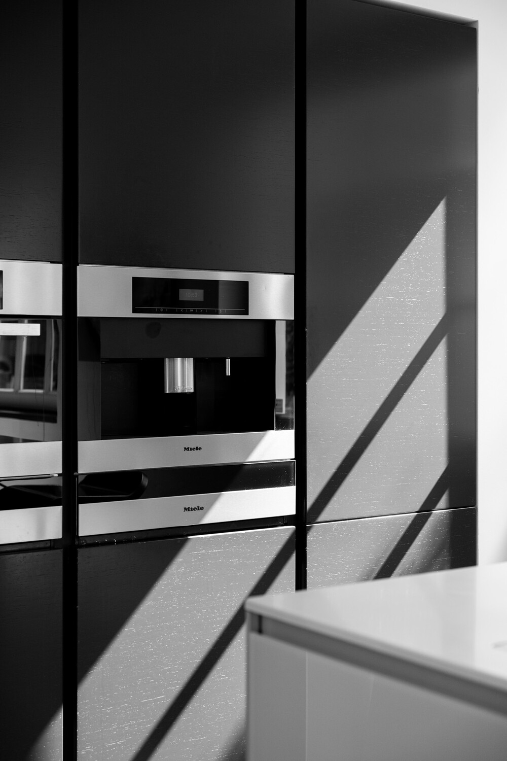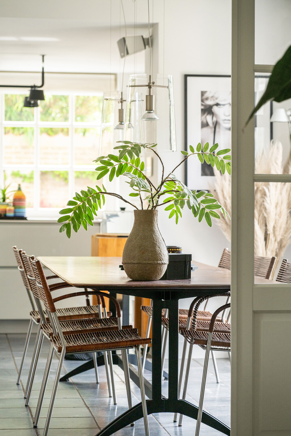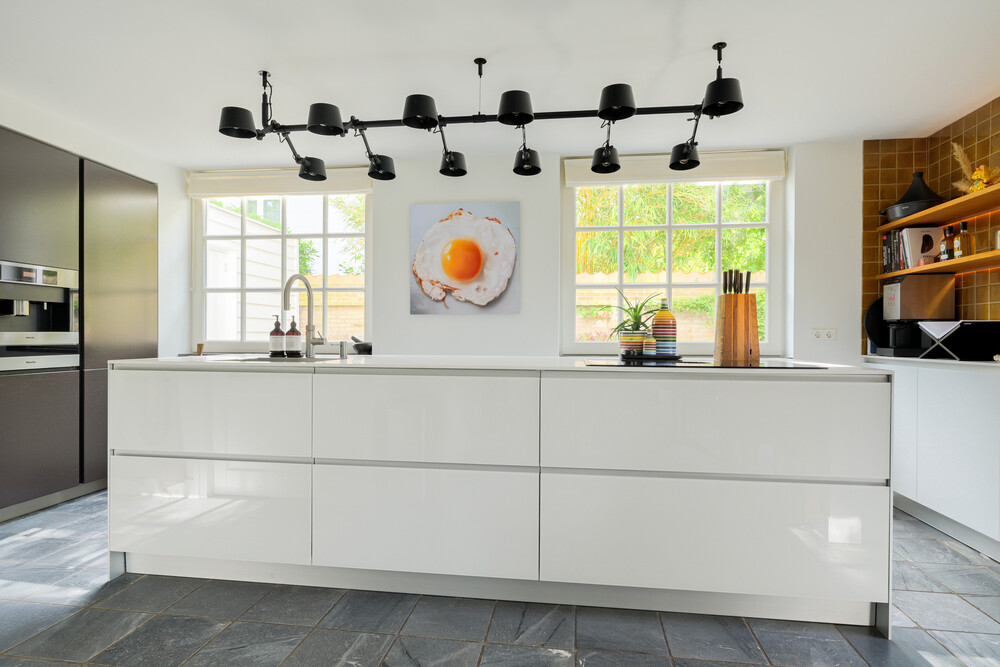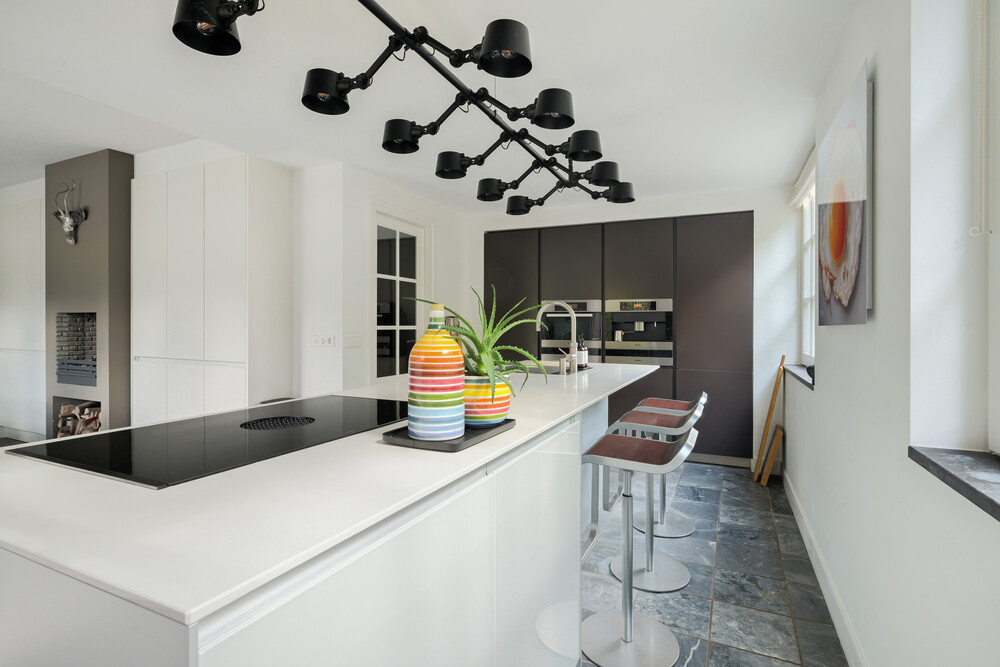 Keuken met luxe inrichting van het merk Valcucine, bestaand uit een eiland met composiet blad met RVS spoelbak, combi- Quooker, BORA- inductiekookplaat met afzuiger (geïntegreerd), een eetbar en diverse kasten en lades. Wandmeubel met 2 koelkasten, een vriezer, espressomachine, combi-oven en 2 warmhoudlades en een vaatwasser. Aan de andere zijde is een meubel/koffiecorner geplaatst met klein composiet werkblad en kastruimte. Een loopdeur biedt toegang tot de tuin.Eetkamer