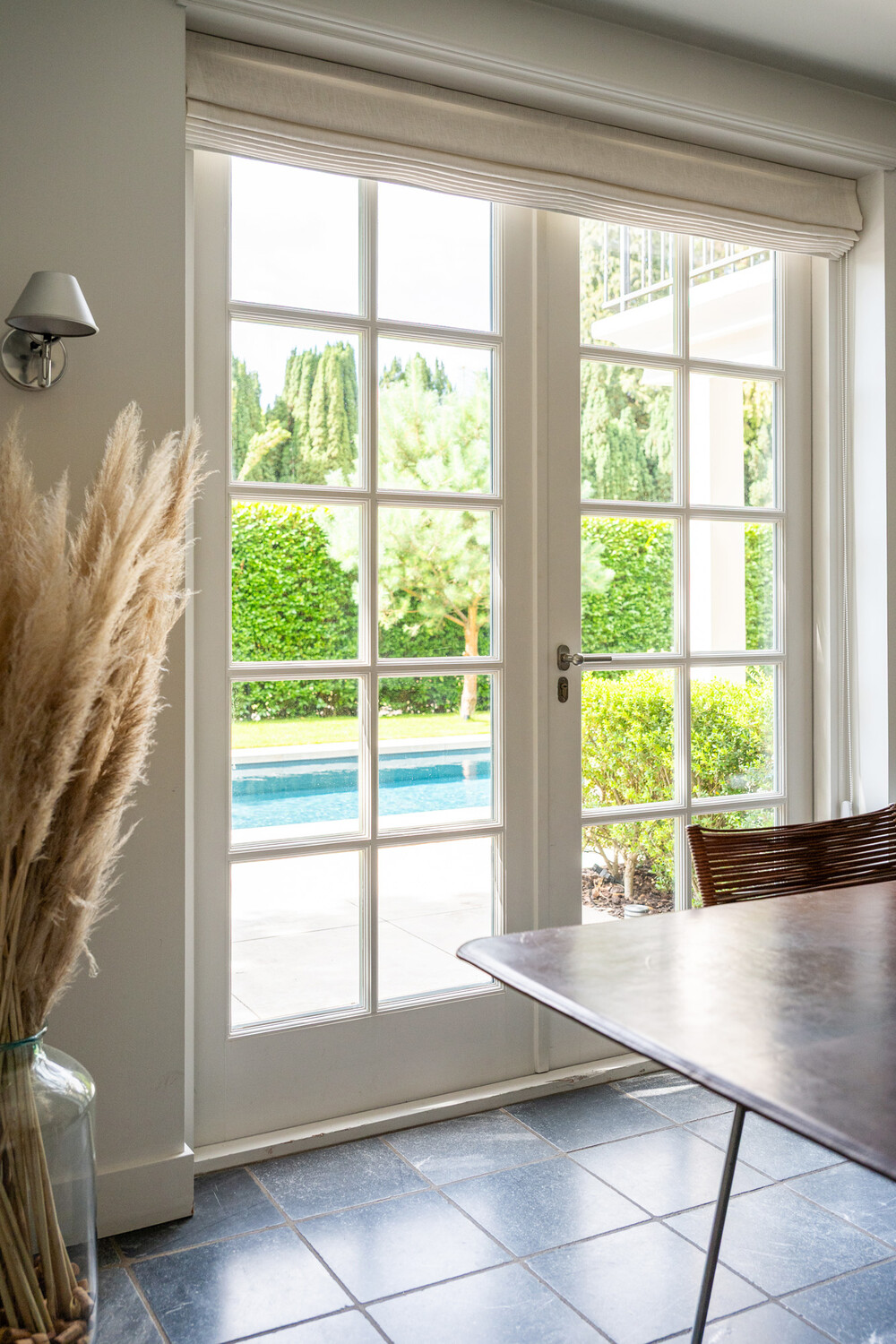 De eetkamer grenst aan de keuken en gaat over in de woonkamer. In deze eetkamer tref je een wandmeubel met veelkastruimte en een in een meubel geïntegreerde gashaard. Openslaande deuren verbinden deze kamer met de tuin.
