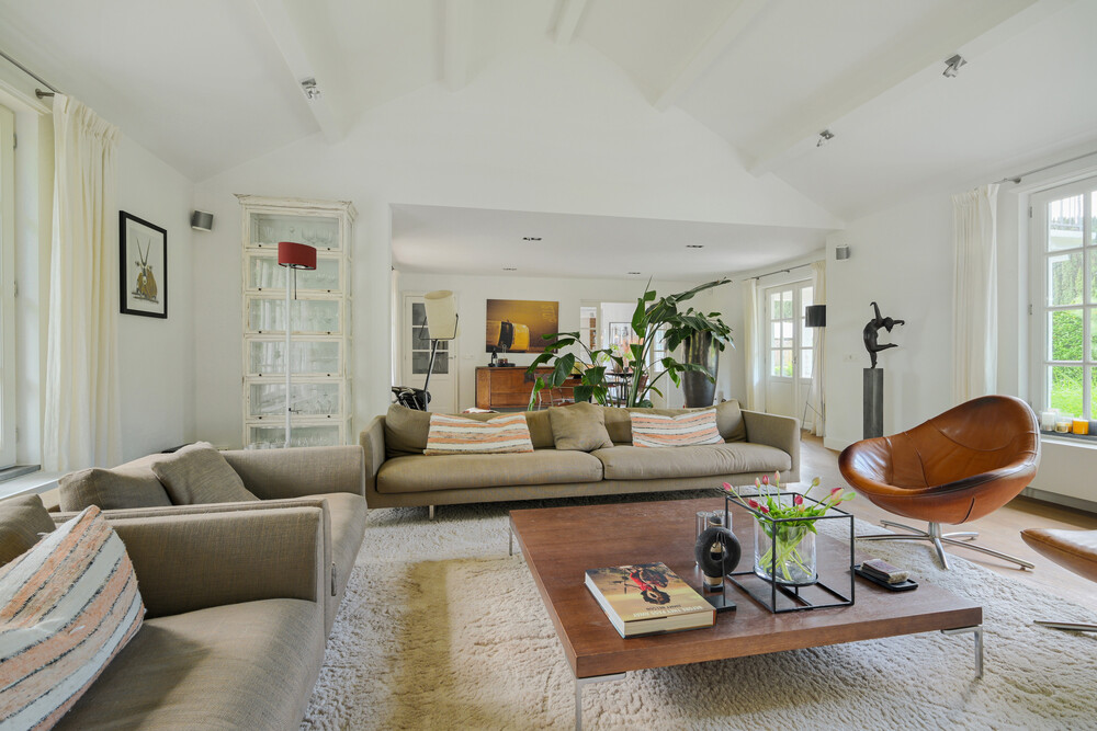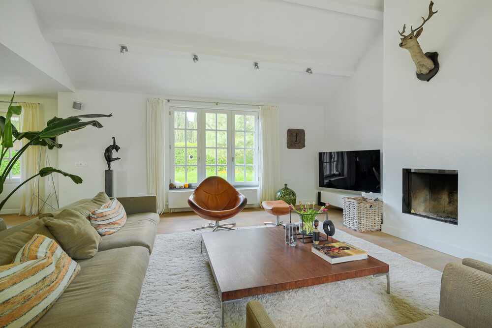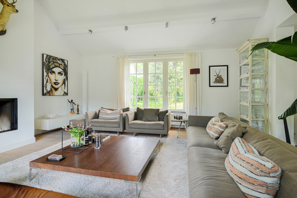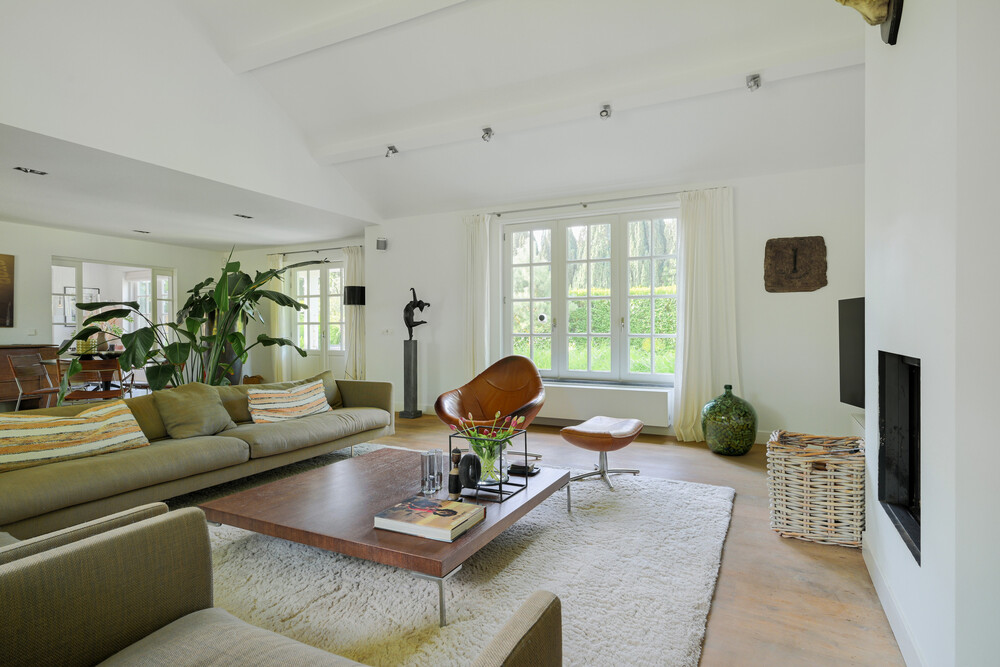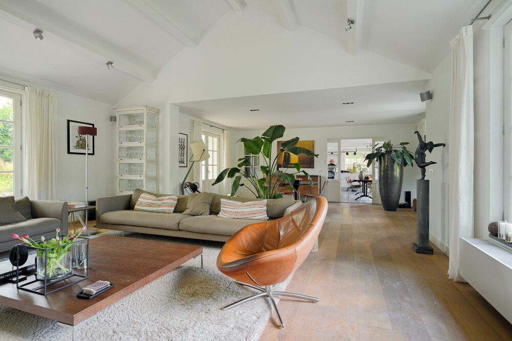 Riante, lichte woonkamer met zowel aan voor- als achterzijde dubbele deuren naar de tuin. In deze woonkamer, die geheel is voorzien van brede houten vloerdelen, is een moderne schouw met inzethaard (houtgestookt) geplaatst. Het hoge loft-achtige plafond geeft een heerlijk ruimtelijk gevoel. Bovendien heb je vanuit de woonkamer fantastisch zicht op zowel de voor- als achtertuin. Woonkamer en eetkamer zijn van elkaar gescheiden middels schuifdeuren.