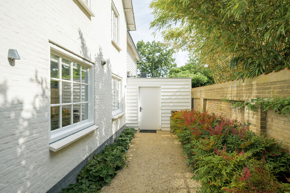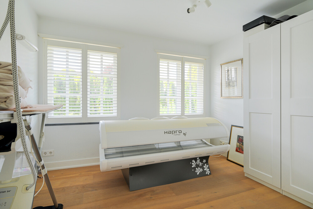 Naast de woning is een zeer ruime berging geplaatst, deze is voorzien van water- en electra-aansluitingen. Ook tref je hier de (volautomatische) zwembadinstallatie alsmede een extra groepenkast. Deze ruime berging biedt daarnaats plaats aan tuingereedschap, fietsen etc. etc. Aan de voorzijde, middels een elektrisch bedienbare poort afsluitbaar, is parkeergelegenheid voor meerdere auto's.