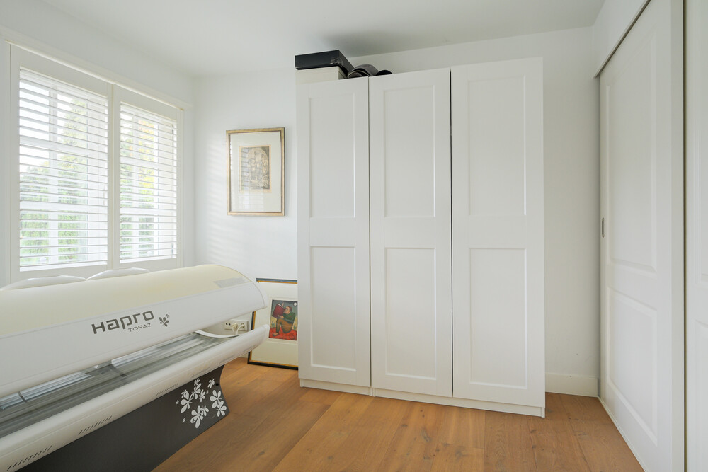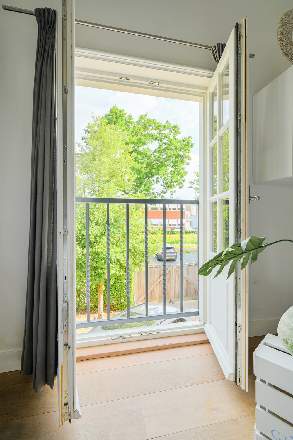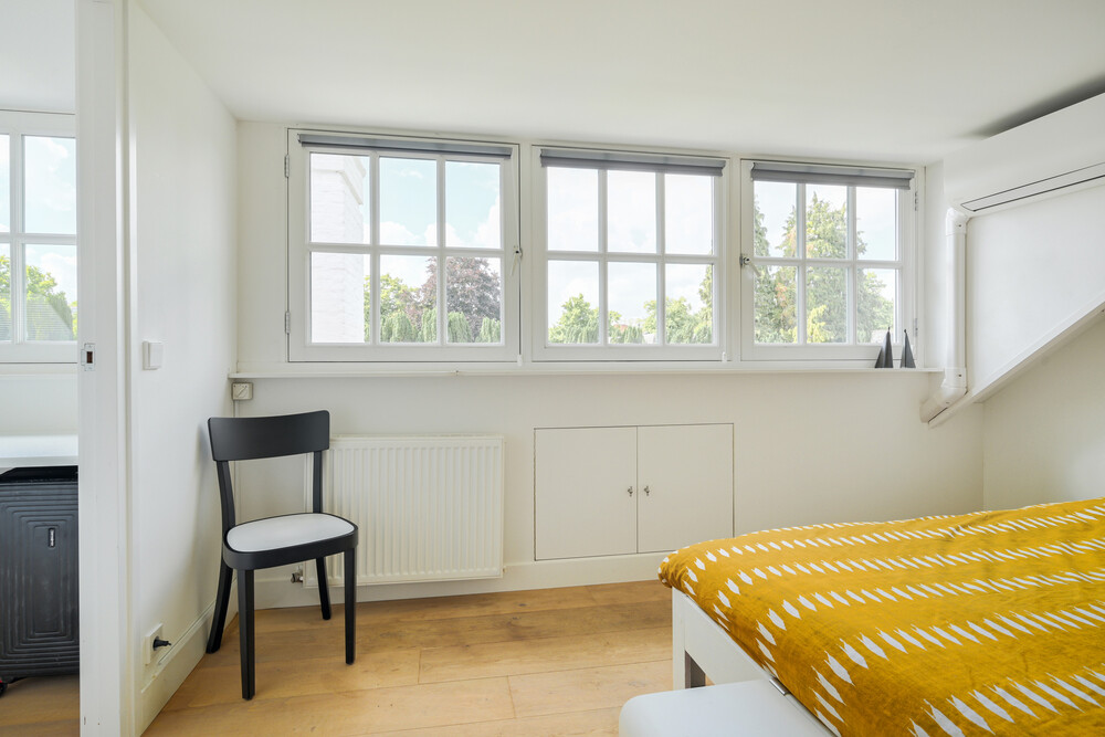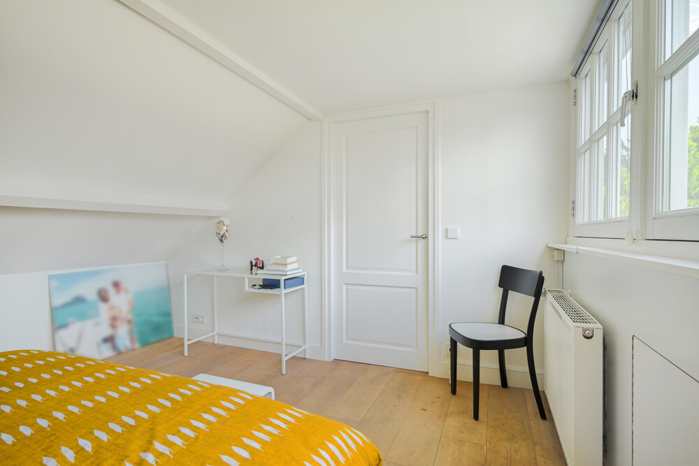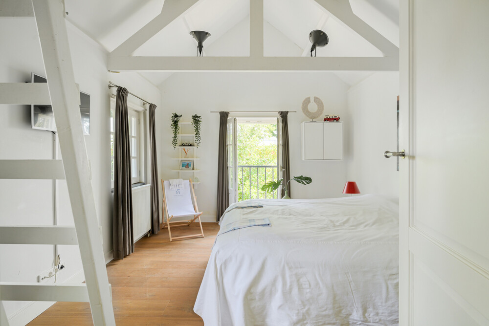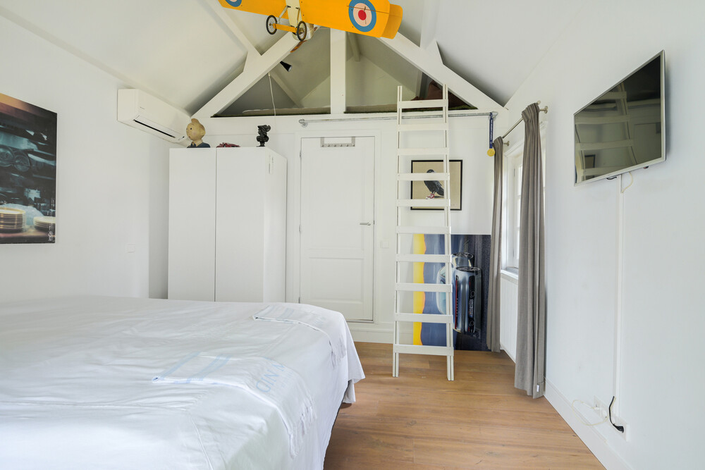 Ruime voorslaapkamer met Frans balkon en extra ruimtelijk effect doordat de kapconstructie in het zicht gebleven is. In deze kamer tref je een entresol/hoogslaper. Bovendien is deze kamer voorzien van airconditioning.Grote vaste kast waarin aansluitpunten ten behoeve van wasmachine en droger.