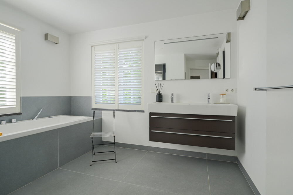 Badkamer met luxe inrichting, bestaand uit riante inloopdouche met hand- en regendouche, ligbad met designkraan enwastafelmeubel met brede wastafel en dubbele kranen.