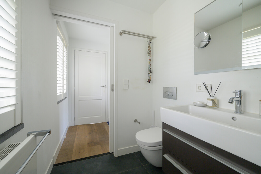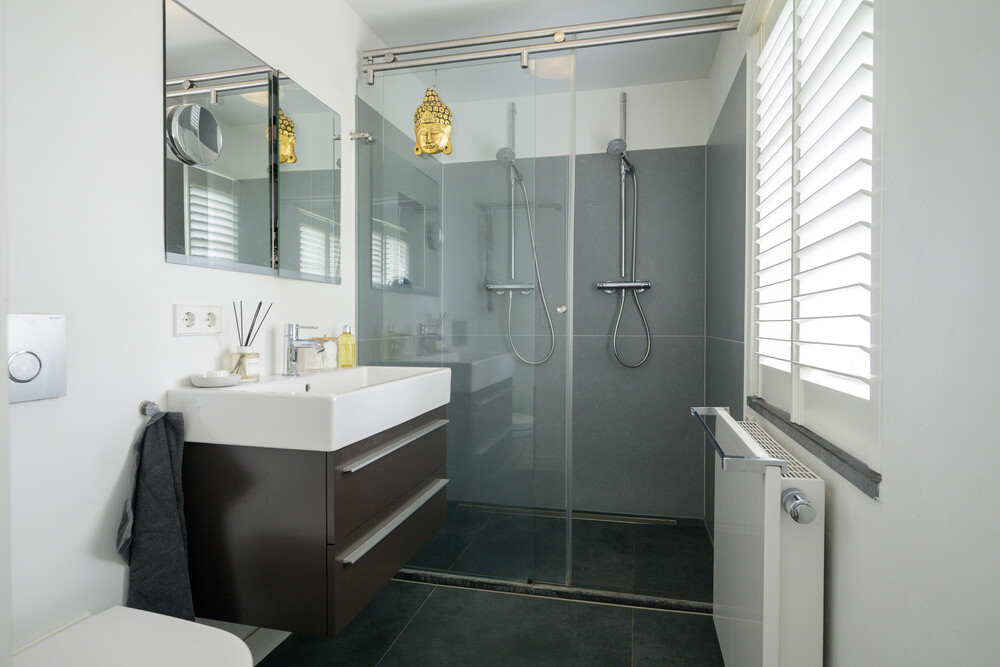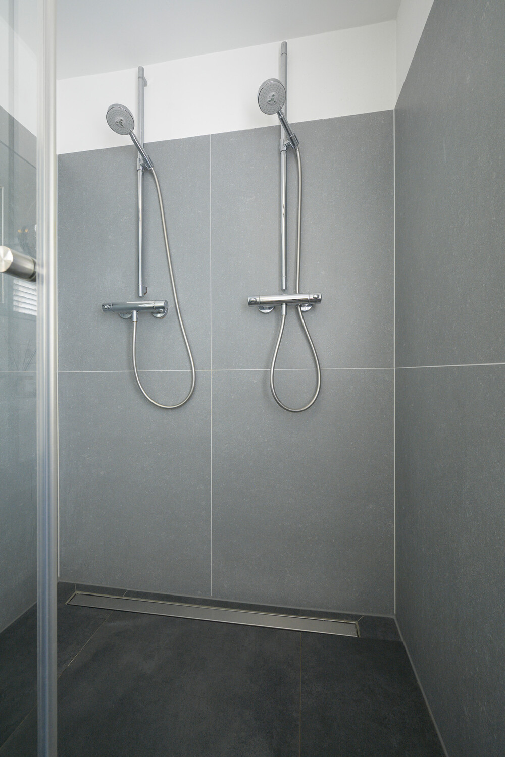 Aangrenzend treft u de tweede badkamer met inloopdouche met dubbele douchekop met thermostaatkranen, een wastafelmeubel en een toilet met inbouwreservoir.