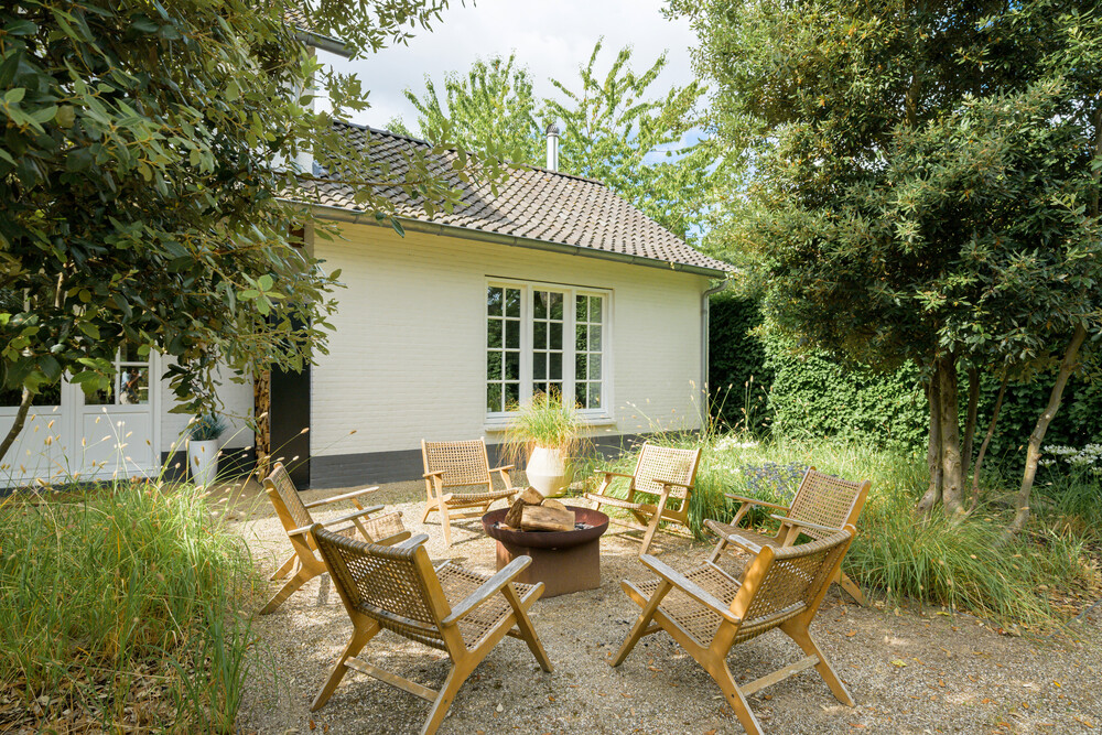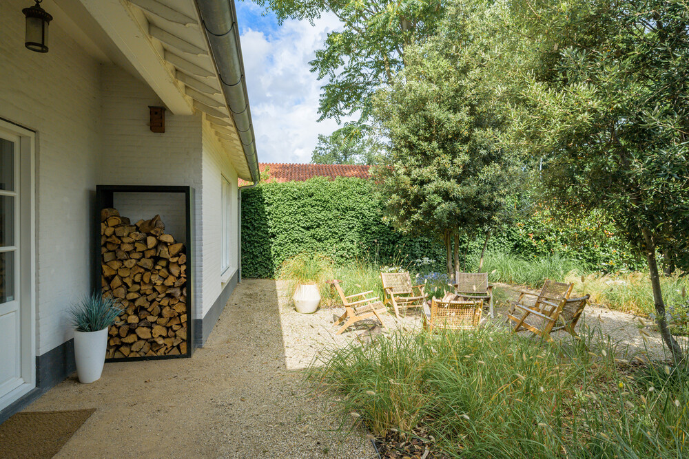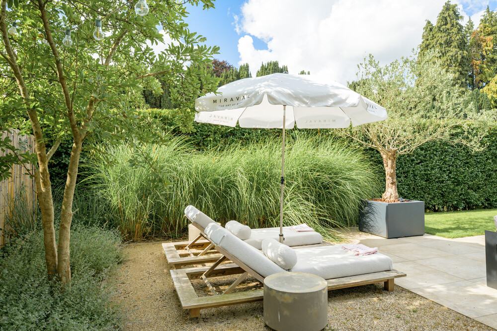 De tuin is ontworpen door Ronnie Renette, Arterior en voorzien van een gazon, een modern, strak zwembad met roldek/solardek en warmtepomp, diverse terrassen. In de borders tref je variërende beplanting, siergrassen etc. Ooktref je in deze prachtig aangelegde tuin diverse boompjes en hagen.
