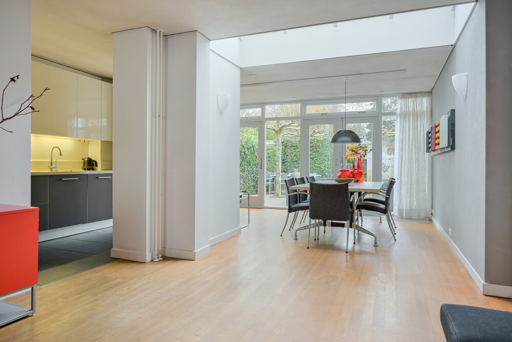 De tuinkamer grenst aan de keuken en de woonkamer. Zowel de grote pui aan de achterzijde als de lichtstraat zorgen voor prachtige lichtinval.De woon- en tuinkamer zijn uitgevoerd met een mooie parketvloer (esdoorn), de keuken met grijze plavuizen.