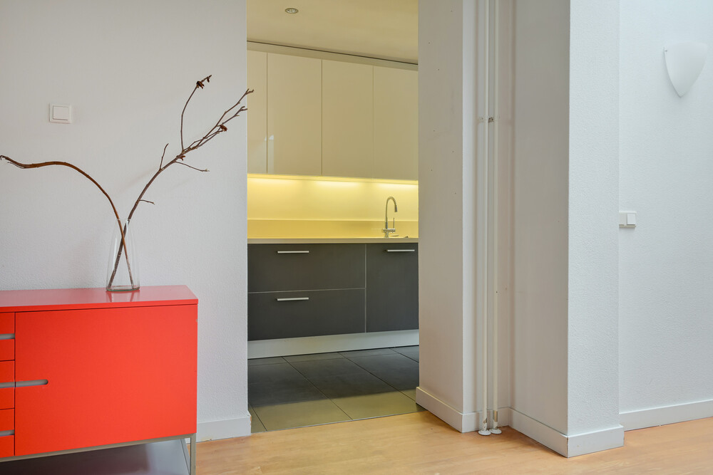 De keuken is in het midden van de ruimte geplaatst, tussen de woon- en tuinkamer. De keuken is voorzien van een maatwerk-keukeninrichting van het merk Varenna en bestaat uit een inrichting in hoekopstelling, met een composiet blad met RVS-spoelbak, een 90 cm brede gaskookplaat, een RVS-afzuigkap, een vaatwasmachine en diverse kasten en laden. In het meubel zijn de oven en de koelkast geplaatst. In een extra wandmeubel zijn de vriezer, espressomachine en warmhoudladen geplaatst, evenals een apothekerskast.Tuinkamer
