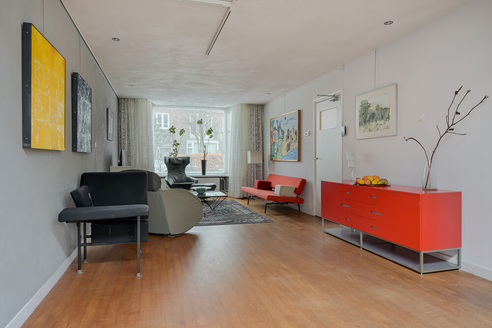 Ruime, lichte woonkamer met brede erker. Het zitkamergedeelte is aan de voorzijde gesitueerd.Keuken