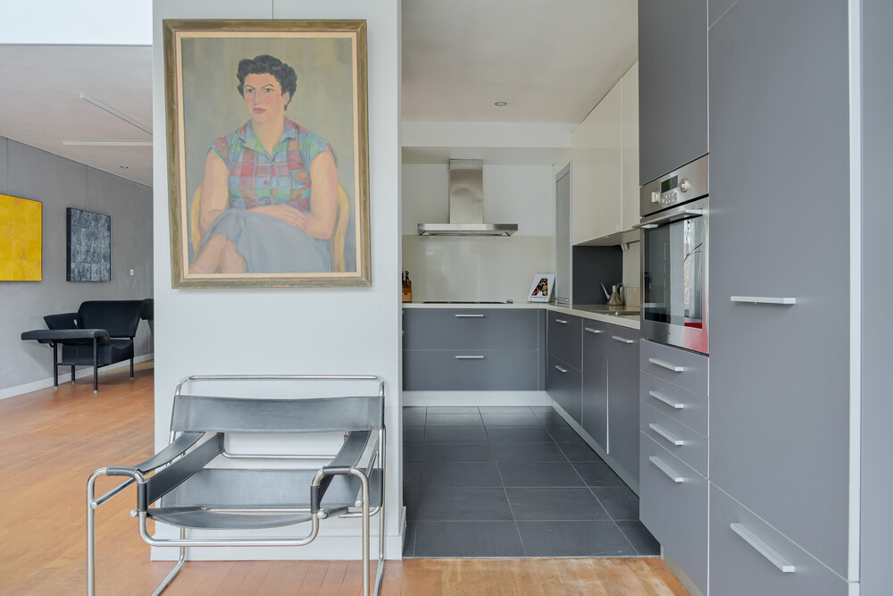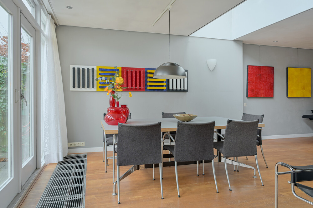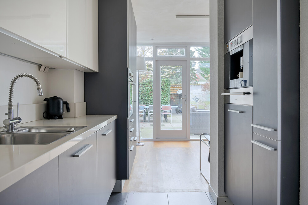 De tuinkamer grenst aan de keuken en de woonkamer. Zowel de grote pui aan de achterzijde als de lichtstraat zorgen voor prachtige lichtinval.De woon- en tuinkamer zijn uitgevoerd met een mooie parketvloer (esdoorn), de keuken met grijze plavuizen.