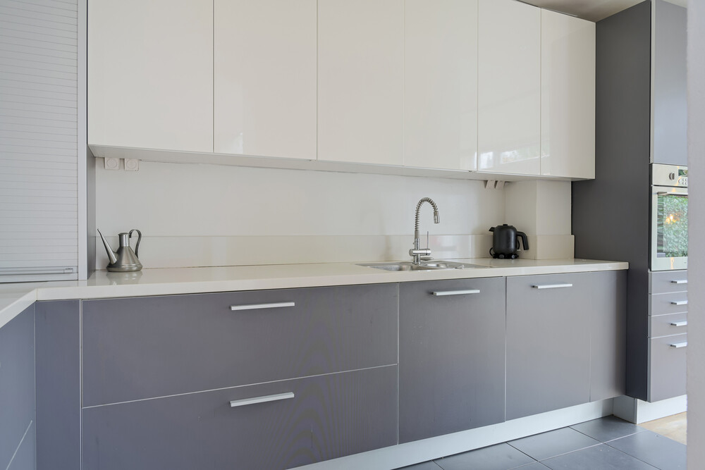 De keuken is in het midden van de ruimte geplaatst, tussen de woon- en tuinkamer. De keuken is voorzien van een maatwerk-keukeninrichting van het merk Varenna en bestaat uit een inrichting in hoekopstelling, met een composiet blad met RVS-spoelbak, een 90 cm brede gaskookplaat, een RVS-afzuigkap, een vaatwasmachine en diverse kasten en laden. In het meubel zijn de oven en de koelkast geplaatst. In een extra wandmeubel zijn de vriezer, espressomachine en warmhoudladen geplaatst, evenals een apothekerskast.Tuinkamer