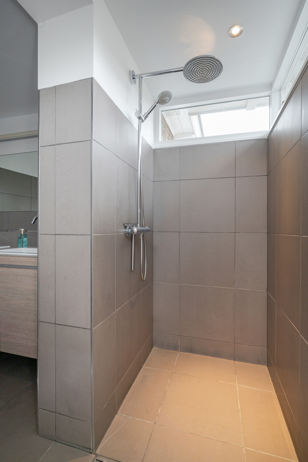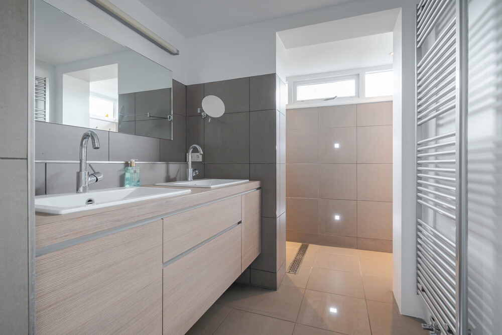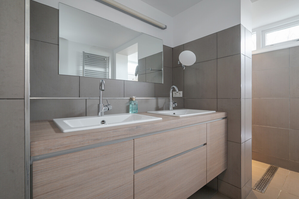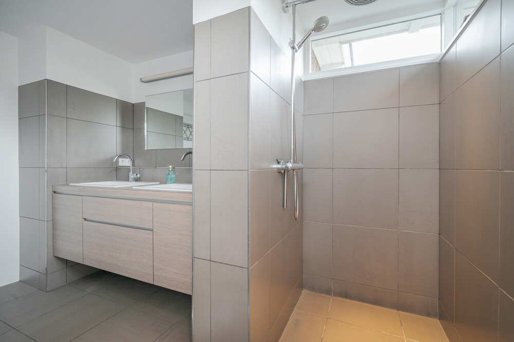 Uitgebouwde badkamer; deze badkamer is voorzien van een moderne inrichting met een breed meubel met dubbele wastafel en veel bergruimte in laden.De grote, lichte inloopdouche is in de uitbouw geplaatst en is voorzien van een hand- en regendouche.