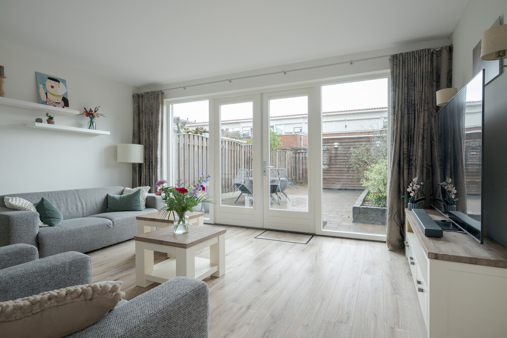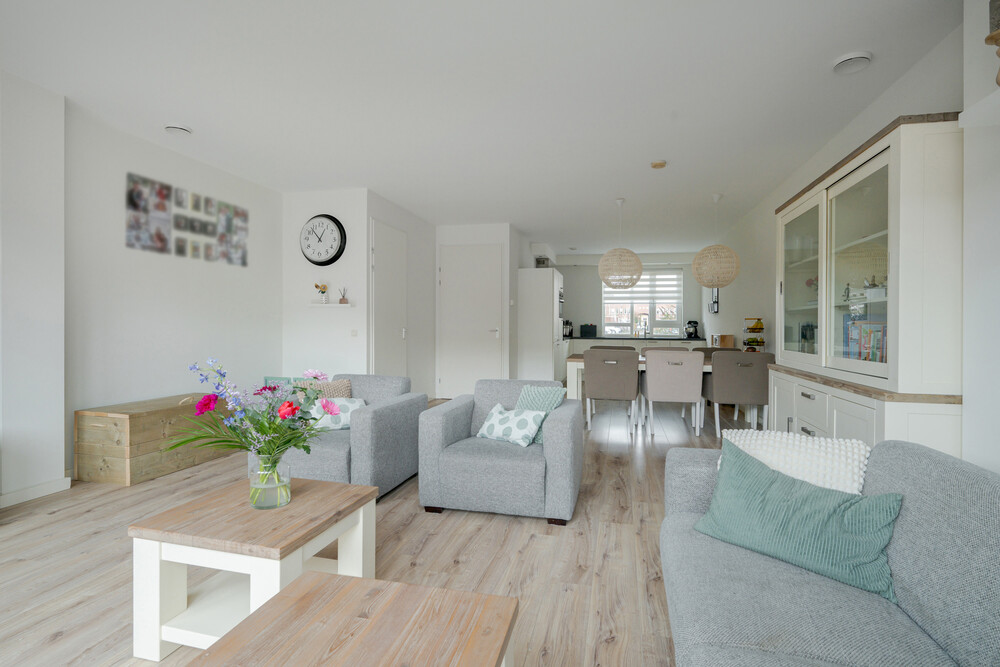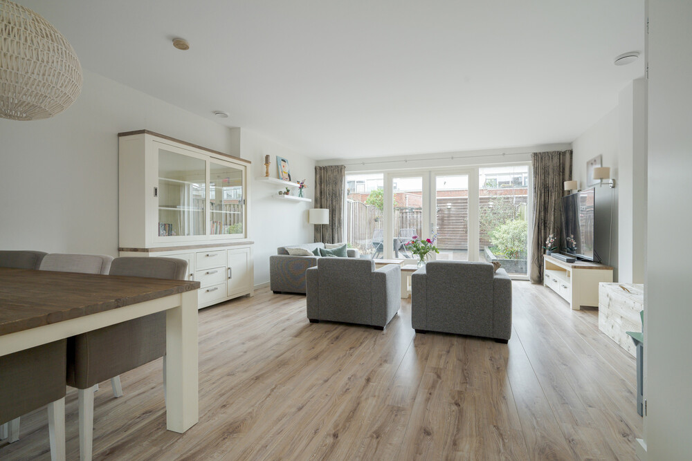 De uitgebouwde en tuingerichte woonkamer staat in open verbinding met de keuken (totaal 11.25 m diep) en heeft dubbele deuren naar de achtertuin. In de woonkamer bevindt zich een ruime provisiekast met de unit ten behoeve van de vloerverwarming/koeling.Keuken