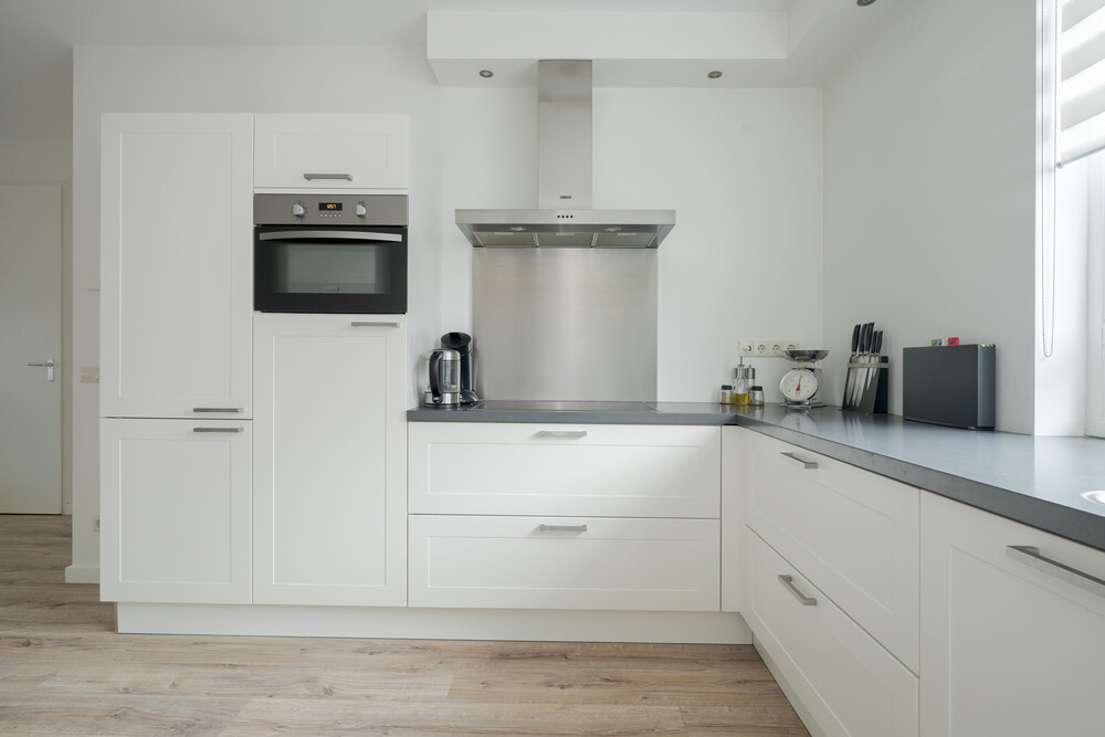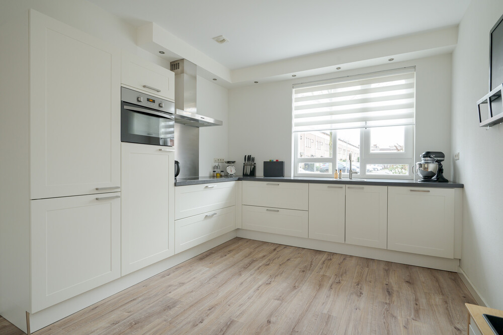De uitgebouwde en tuingerichte woonkamer staat in open verbinding met de keuken (totaal 11.25 m diep) en heeft dubbele deuren naar de achtertuin. In de woonkamer bevindt zich een ruime provisiekast met de unit ten behoeve van de vloerverwarming/koeling.Keuken