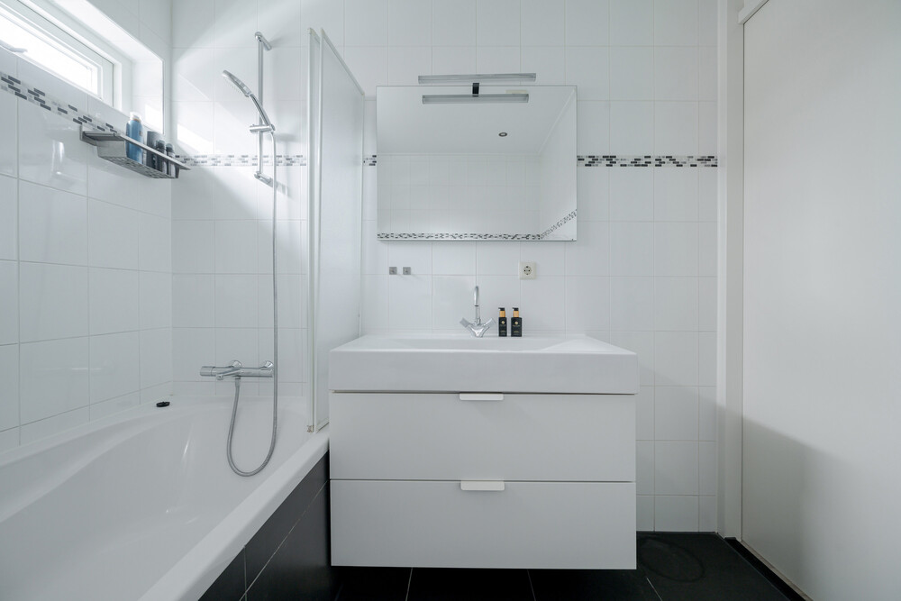De moderne badkamer (ca. 2.15 x 2.20 m) is voorzien van een ligbad met douchegedeelte en thermostaatkraan, toilet en een wastafelmeubel met brede wastafel, laden en een spiegel.