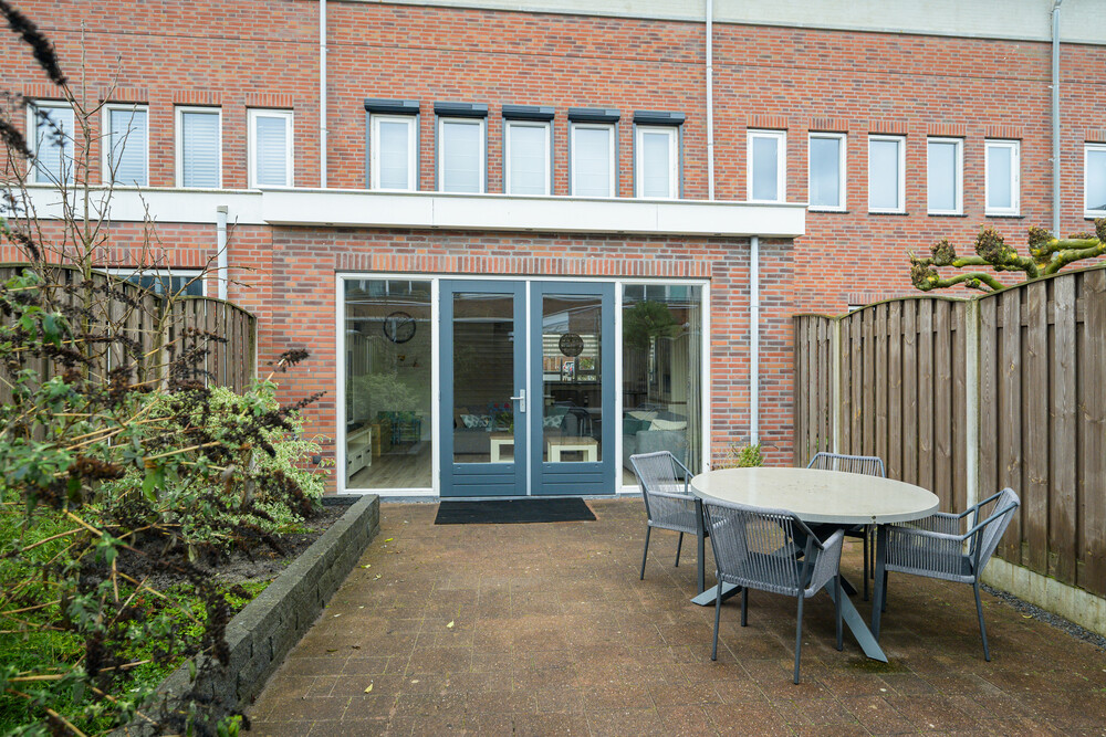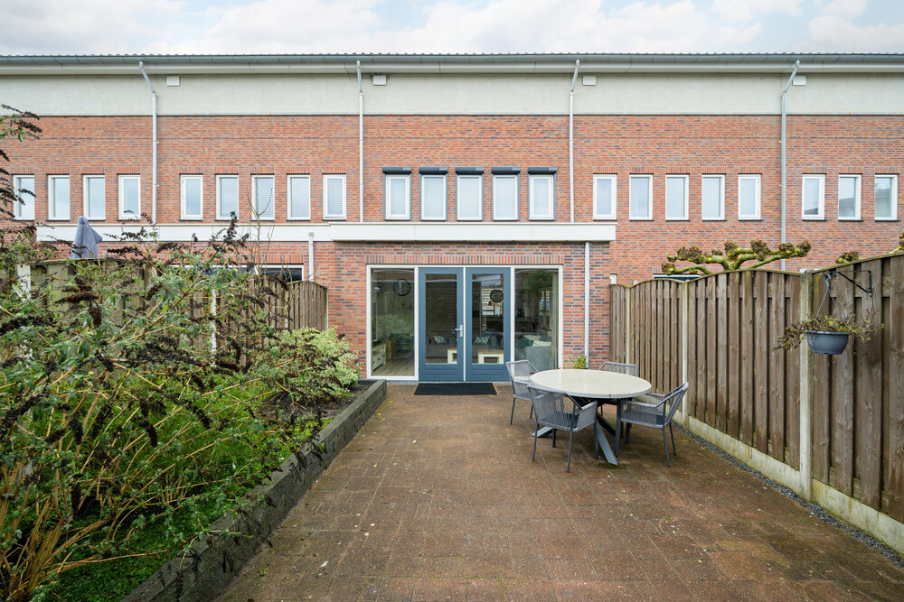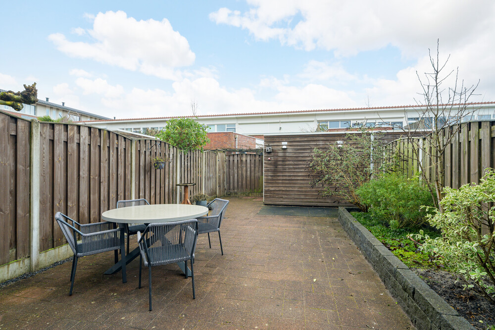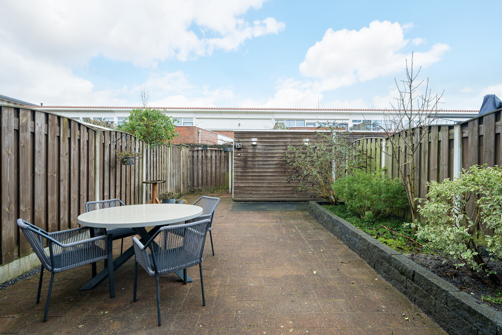 De achtertuin heeft een diepte van ca. 11.50 m en is gesitueerd op het oosten en is aangelegd met betegeling en borders. In de tuin bevindt zich een houten tuinberging (ca. 2.40 x 3.40 m) met elektra en de tuin is te bereiken via een achterom.