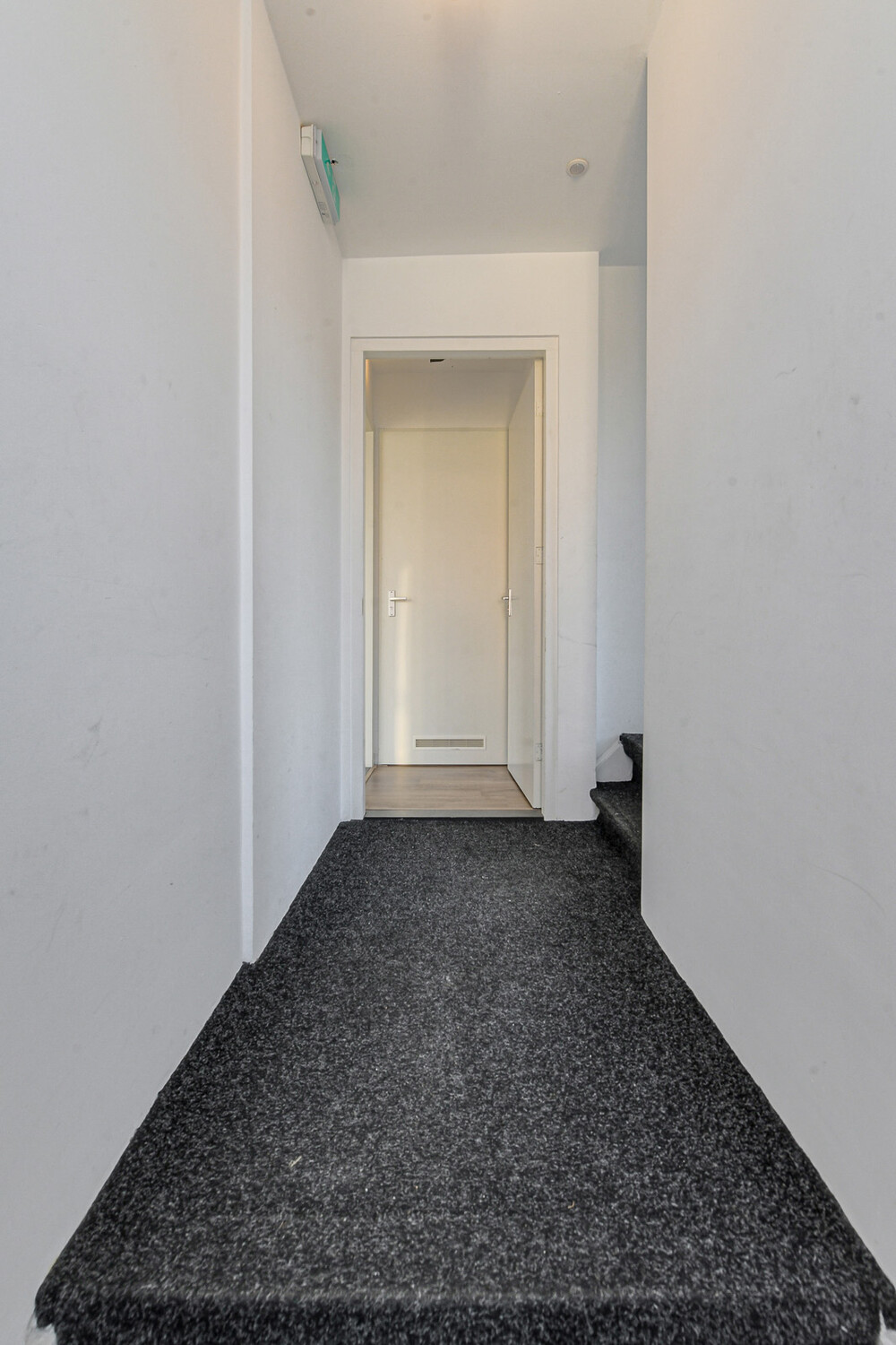 Algemene entree met bellentableau, brievenbussen en intercominstallatie. Portaal met meterkast en trapopgang naar de verdieping.