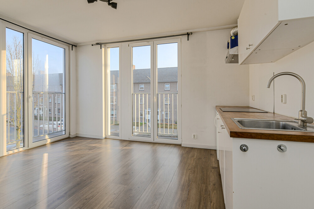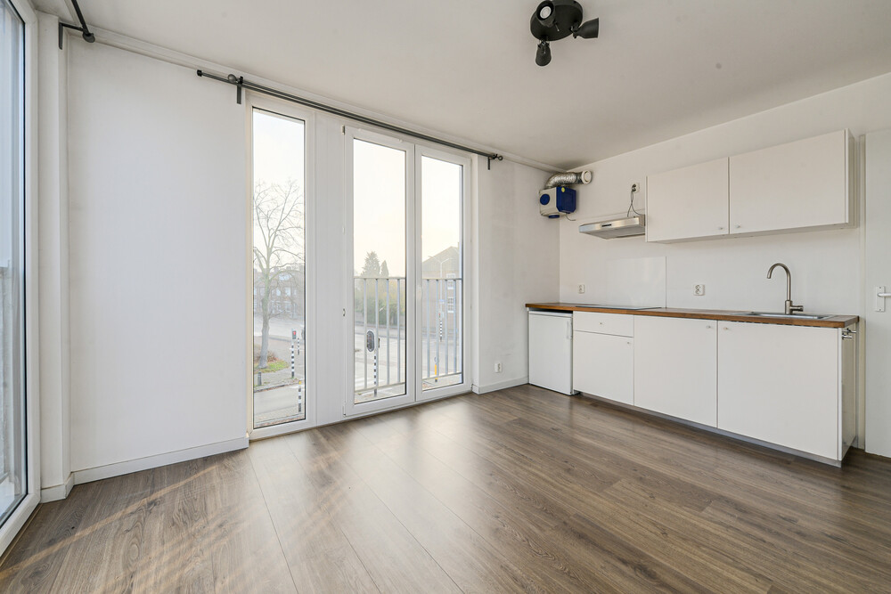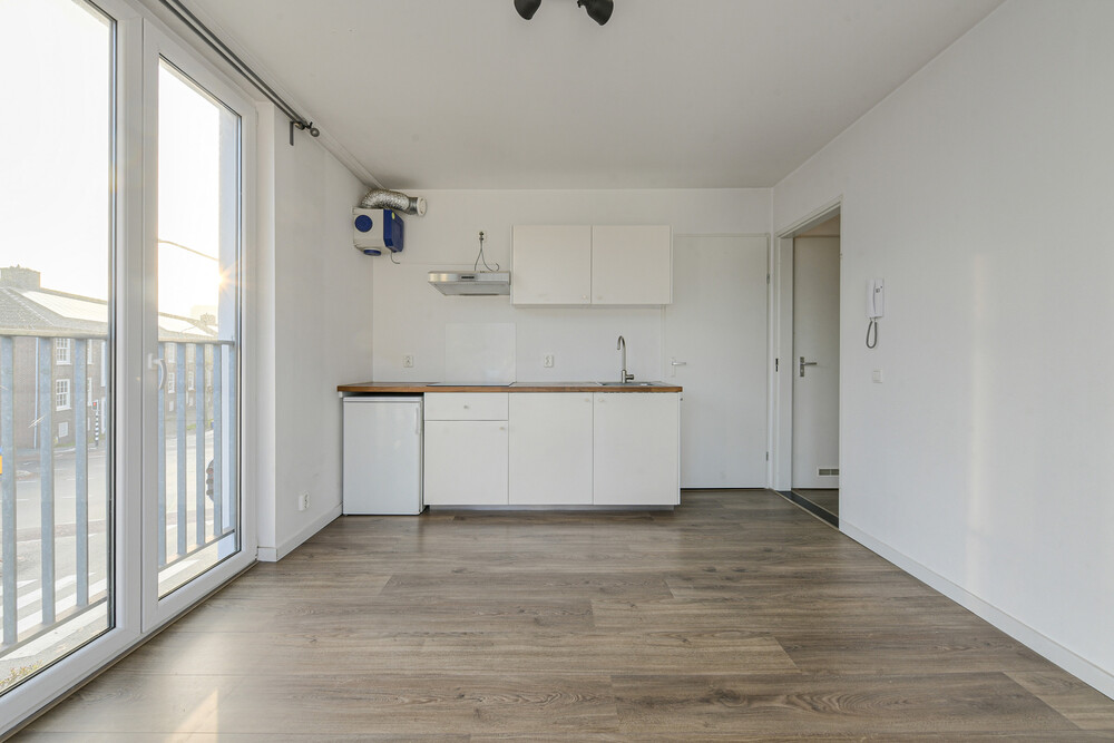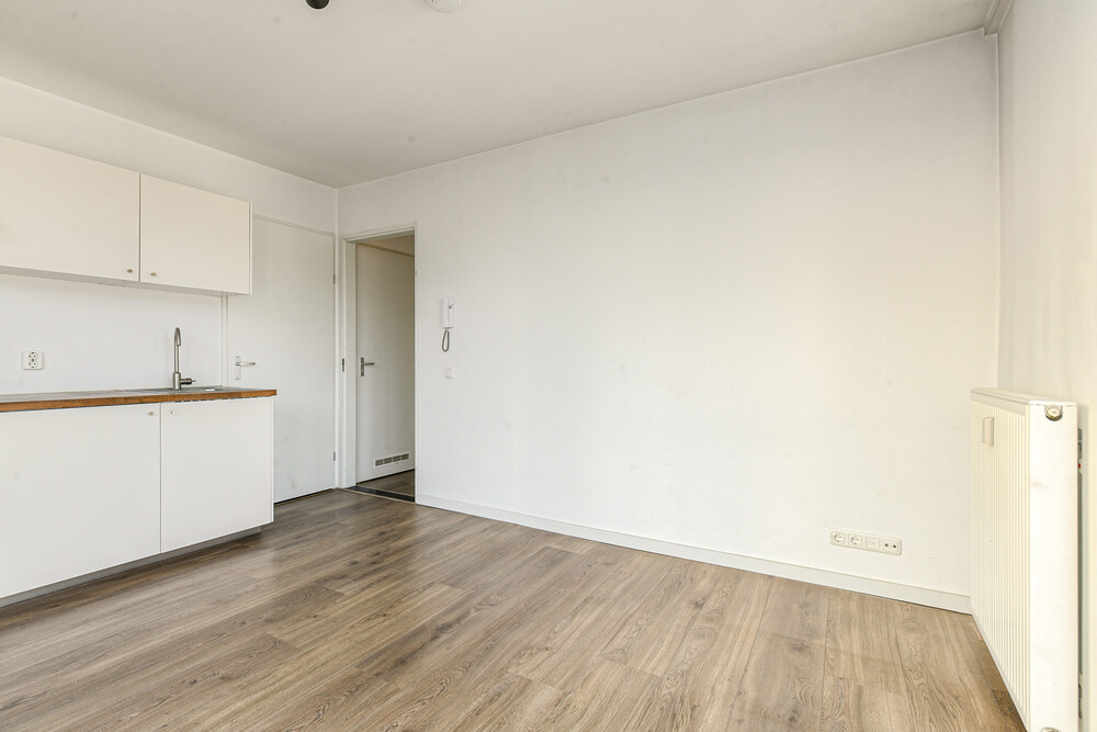 Fijne lichte woonkamer (ca. 4,30 x 3,35 m) met laminaatvloer en 2 Franse balkons. In de woonkamer bevindt zich een nette keukeninrichting bestaande uit een aanrecht met kunststof blad, rvs-spoelbak, keramische kookplaat, afzuigkap, koelkast met vriesvak en enkele onder- en bovenkastjes. Vanuit de woonkamer toegang tot de slaapkamer.Slaapkamer