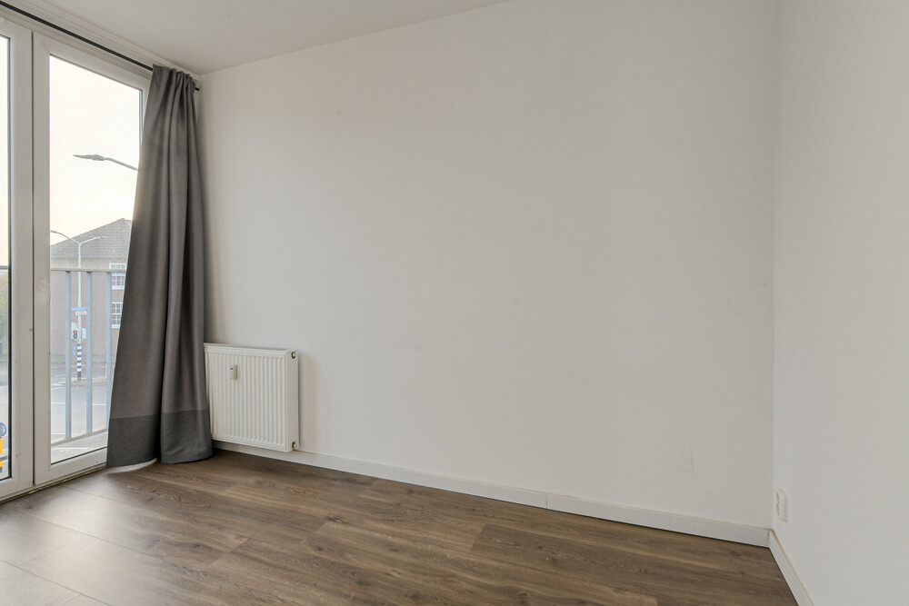 Fijne lichte woonkamer (ca. 4,30 x 3,35 m) met laminaatvloer en 2 Franse balkons. In de woonkamer bevindt zich een nette keukeninrichting bestaande uit een aanrecht met kunststof blad, rvs-spoelbak, keramische kookplaat, afzuigkap, koelkast met vriesvak en enkele onder- en bovenkastjes. Vanuit de woonkamer toegang tot de slaapkamer.Slaapkamer