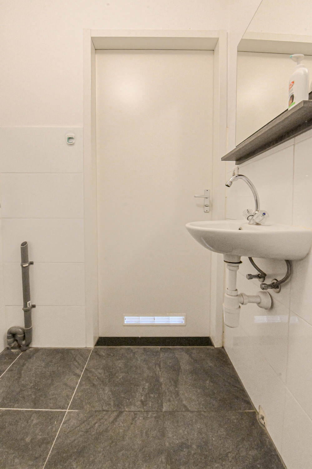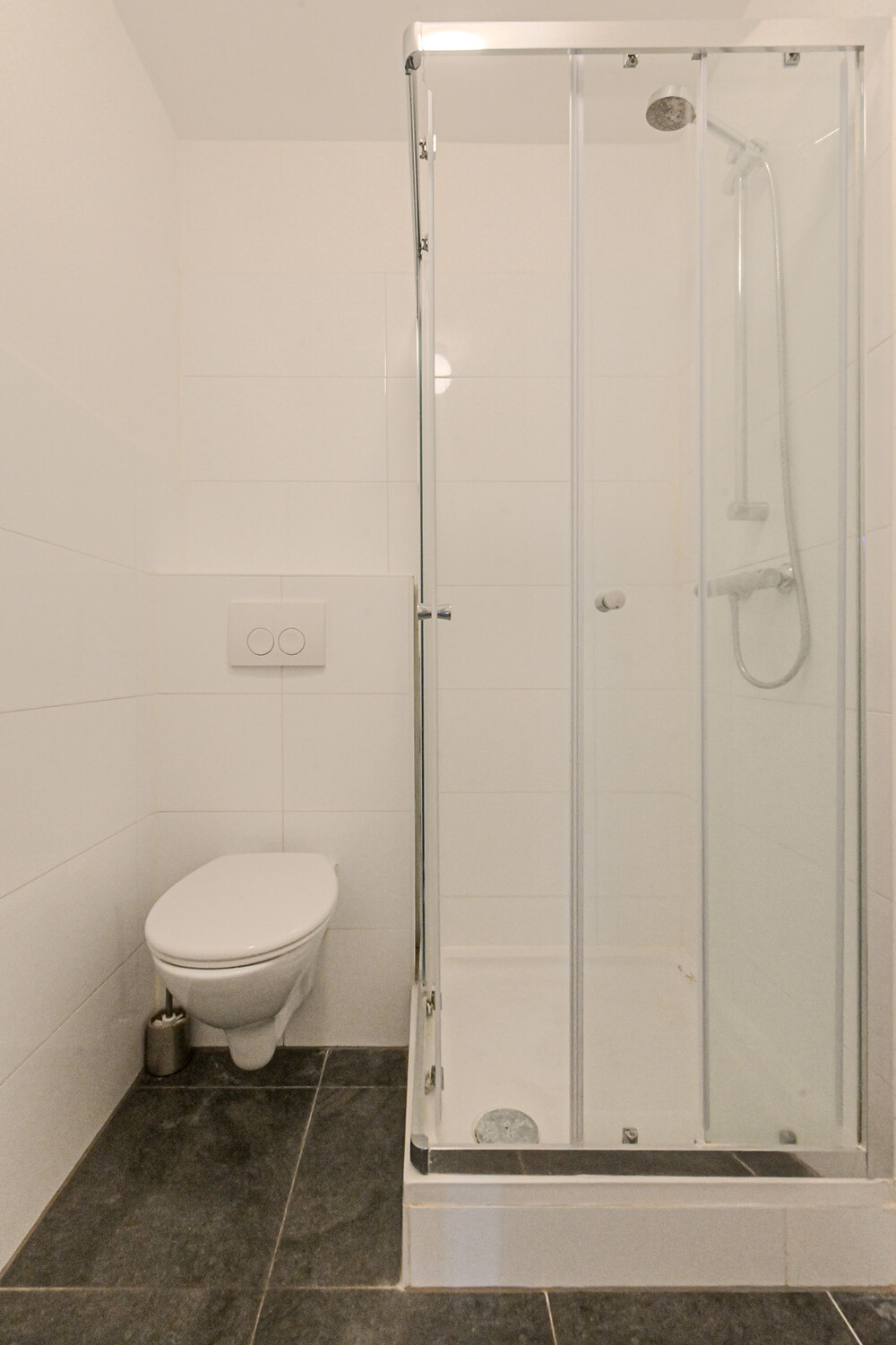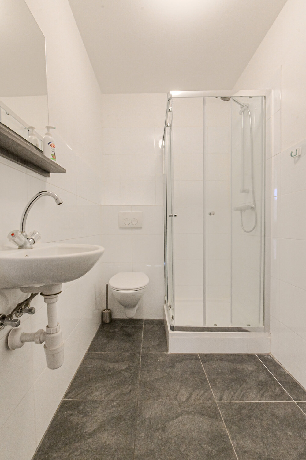 Badkamer (ca. 1,50 x 2,10 m) voorzien van douche met thermostaatkraan, wandcloset met inbouwreservoir en een wasbakje. In de badkamer bevindt zich de aansluiting t.b.v. de wasmachine.Dakterras
