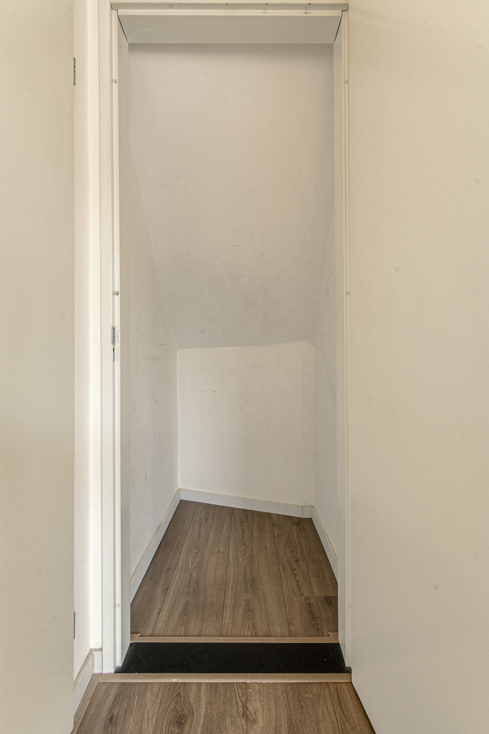 Via overloop met cv-ruimte en toegang tot gezamenlijk dakterras de entree in portaal met bergkast.Woonkamer/keuken