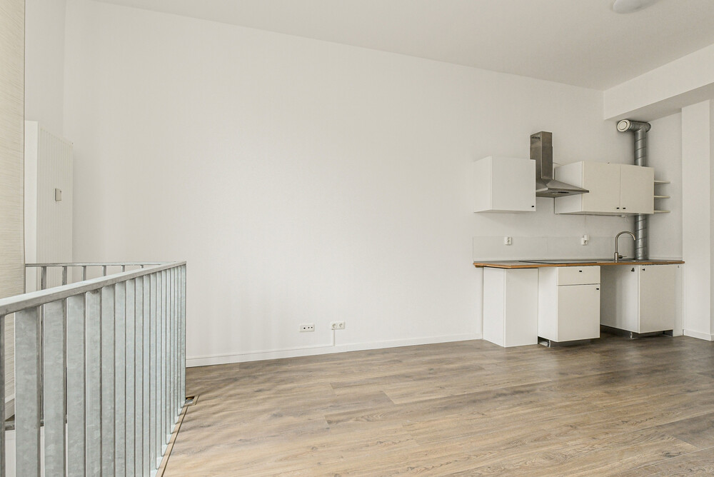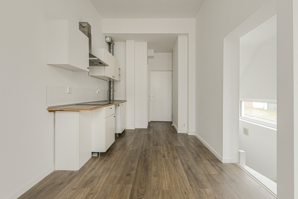 De woonkamer (ca. 6,75 x 4,00/2,69 m) met laminaatvloer is kenmerkend door de mooie daglichtinval en de fraaie plafondhoogte. In de woonkamer bevindt zich een nette keukeninrichting bestaande uit een aanrecht met kunststof blad, rvs-spoelbak, keramische kookplaat, afzuigkap, koelkast met vriesvak en enkele onder- en bovenkastjes. Vanuit de woonkamer toegang tot de in het souterrain gelegen slaapkamer en badkamer.